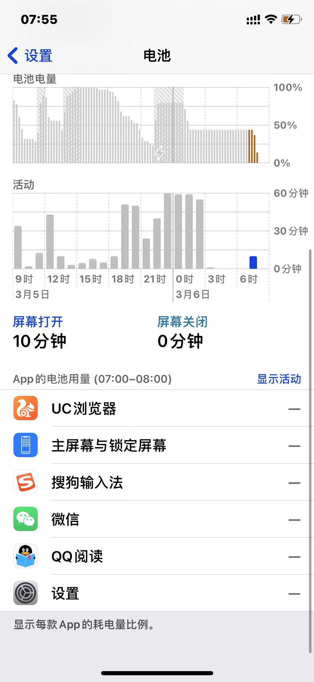 我的更过分 上午十点充满电出门 开了一会导航 接了两个电话 到十一点电量直接剩20% 电量还有40%的时候我要上公交车 所以打开了扫一扫,这一开立刻掉电10%,我惊了一下,以为是显示问题,把扫一扫关掉、锁屏。然后解锁、打开扫一扫,好家伙又掉了10%。我这怕是个吃店怪,但是神奇的是充电快了不少