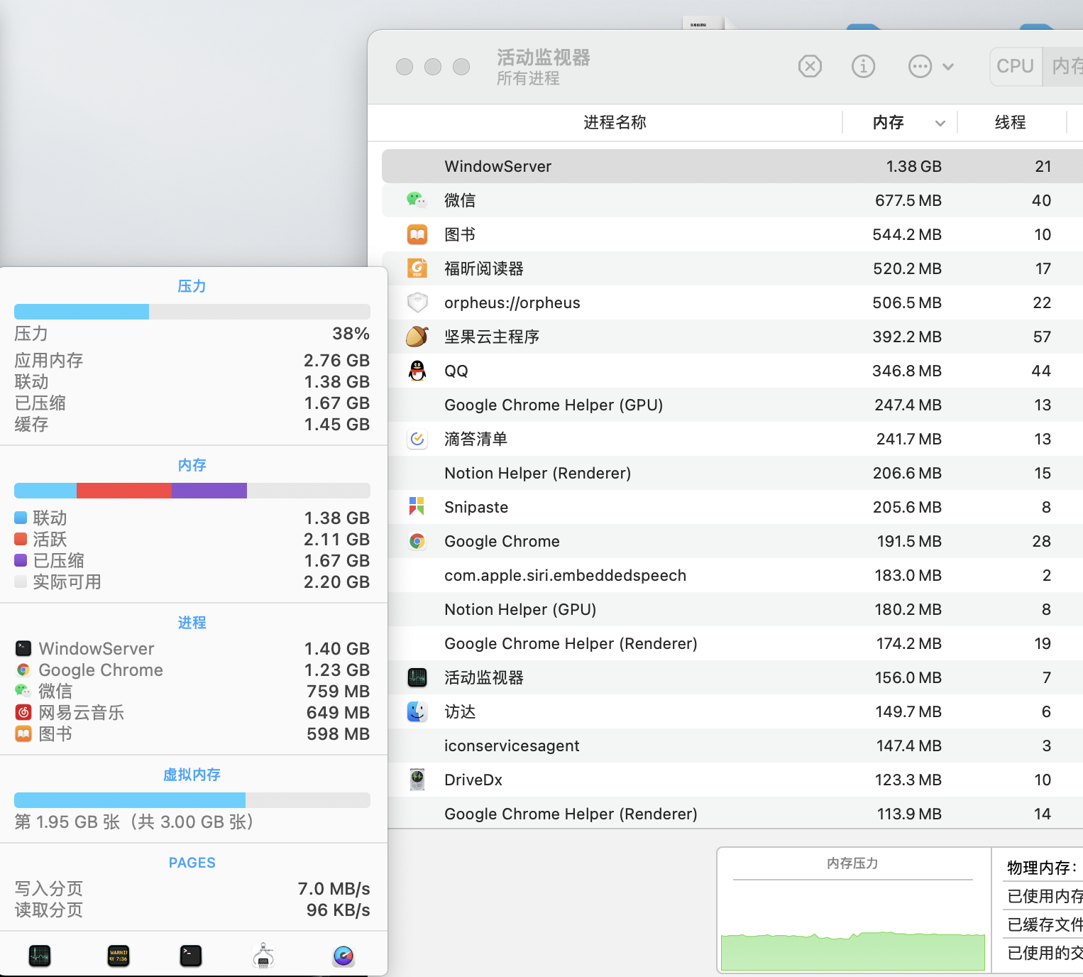 好的,谢谢。我似乎已经找到问题了,的确是我日常使用导致的。虽然内存压力很低,但用iStat Menus看了一下,基本上稍微开个Chrome就占用了不少内存,之后就开始写虚拟内存了,再加上偶尔会用用Xcode,确实会导致磁盘大量读写。