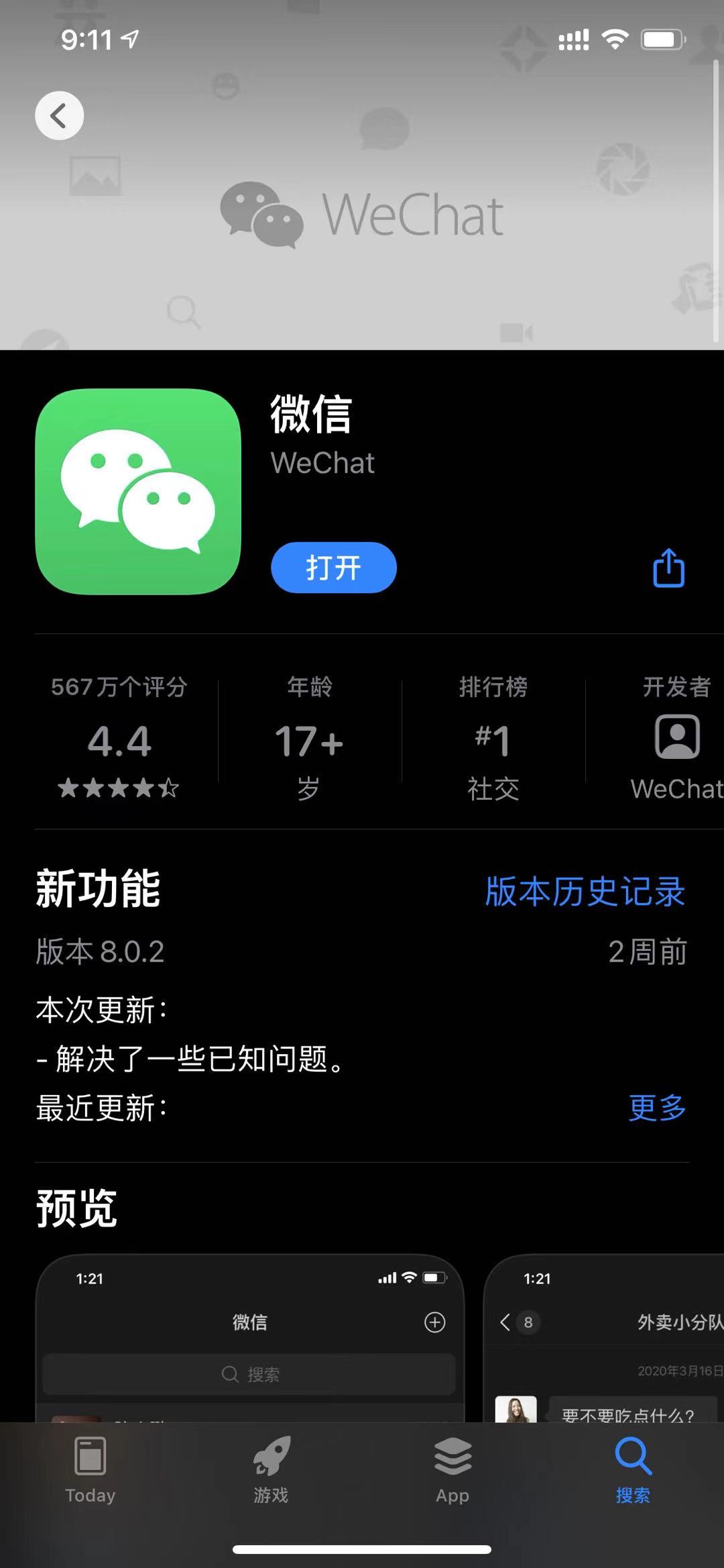 2.在App Store中尝试将微信更新至最新版本,或卸载微信后重新安装(截至2021年2月20日,当前微信最新版本为8.0.2,您可以打开“微信”App,“我-设置-关于微信”中看到当前的微信版本