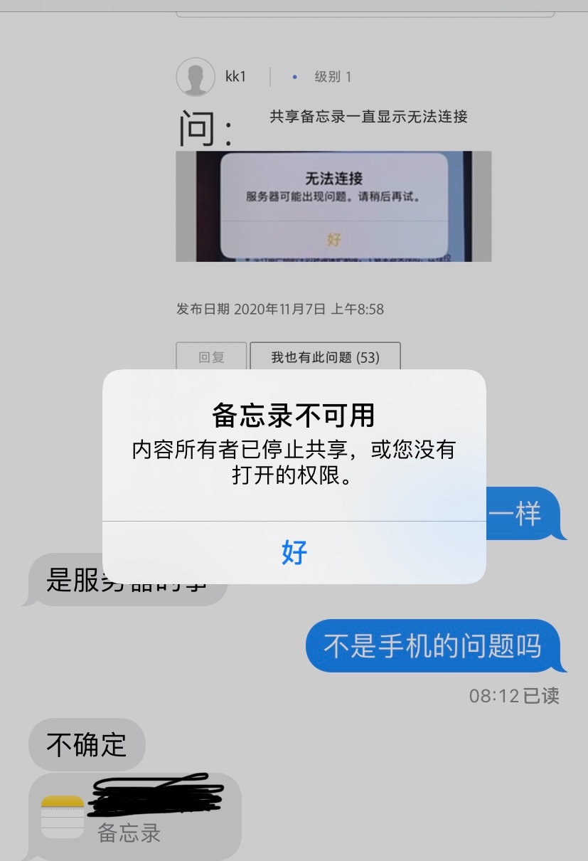 iPhone11,iOS 14.4,备忘录无法共享创建的备忘录,也无法接受别人共享给我的备忘录,都显示无法连接服务器