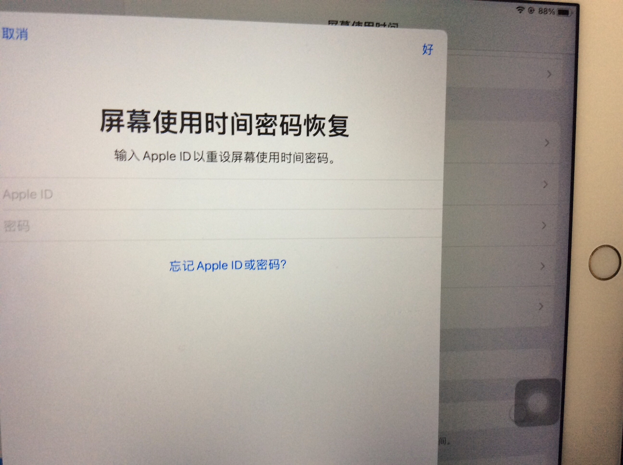 我的ipad,在使用屏幕使用限制密码时忘记了密码,所以想通过“忘记密码”更改,我输入了我的apple id 和密码,都正确了,但就是不行,还算在密码输入错误次数里面。怎么办啊?