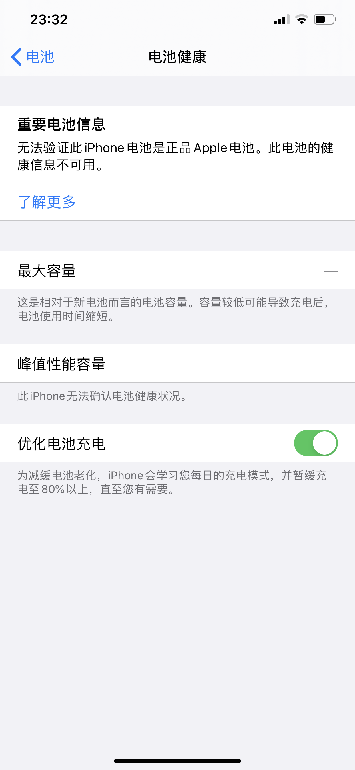 如果您看到这条信息,则表示您 iPhone 中的电池无法验证,并且报告的电池健康信息不可用。这可能是由于安装的电池不是全新正品。