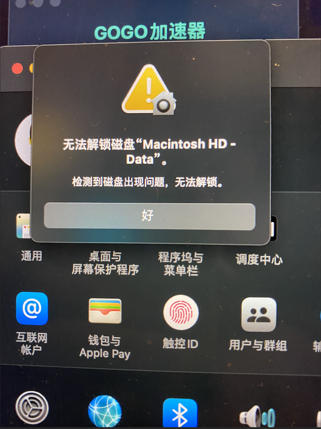 之前的系统太卡了,后来重新装了次系统 开机就会显示 无法解锁磁盘“Macintosh HD" 请问该如何解决啊😭