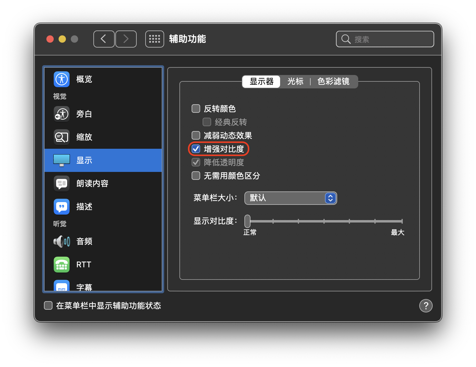 这个看起来像是打开了 macOS 系统辅助功能中增强对比度功能,重装系统也是这样吗?题主可以先检查下“系统偏好设置”-“辅助功能”在左侧边栏中找到“显示”看看是不是勾选了“增强对比度”如果有勾选,去掉试试。