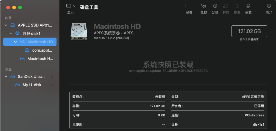 通过进入系统检查,打开磁盘工具发现如下图所示,macintosh hd被停用,而其下多了一个已加载的系统快照,请问这是否是升级big sur后的必然现象?想通过shift+option+command+r的方式进行系统恢复至出厂版本如何解决显示不了Macintosh hd 的问题?
