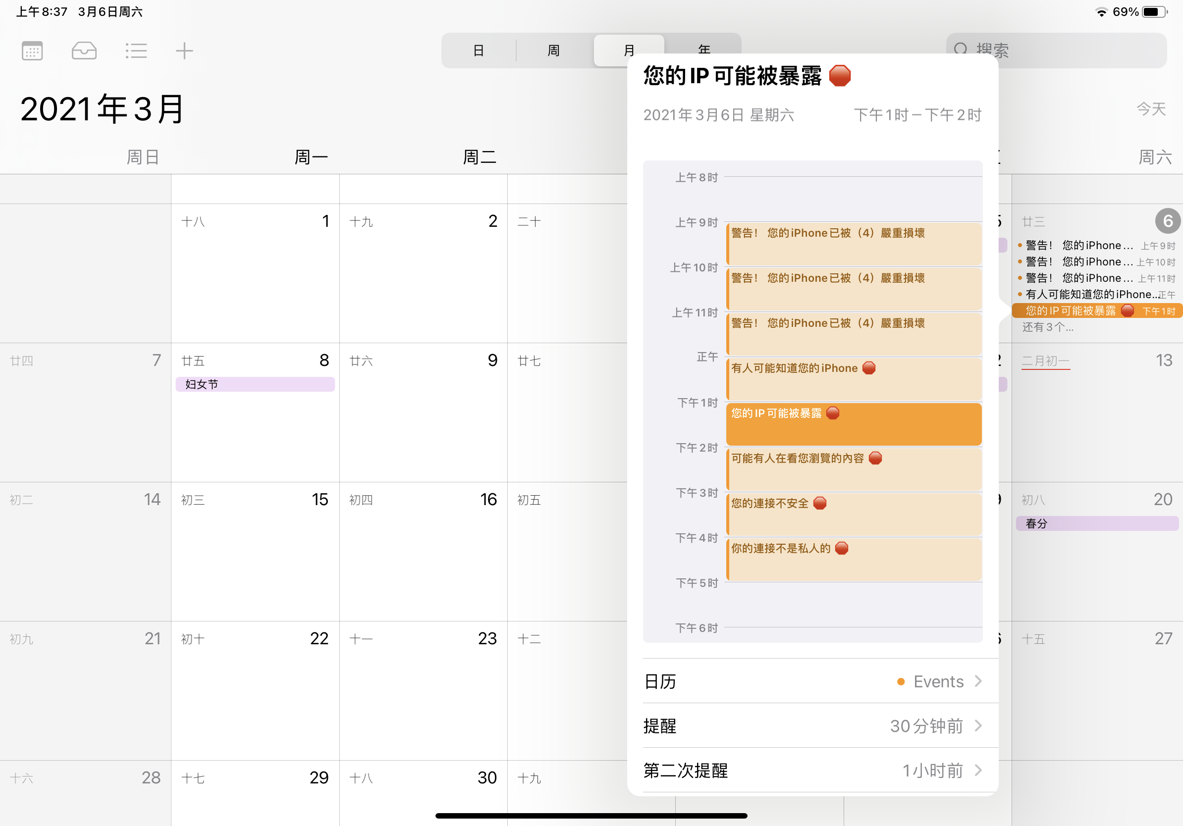 问题被标记为 排名最靠前的回复 以下用户的用户个人资料: SparkWu SparkWu 用户级别: 级别 7 28,336 积分 2021年3月5日 下午6:39 回应 AlexanderLauLau 这个是骗人的,不要相信!请查看“设置”>“日历”>“帐户”>“已订阅的日历”里面是不是一个叫“Event”的订阅,把它删除就好! 回复 链接