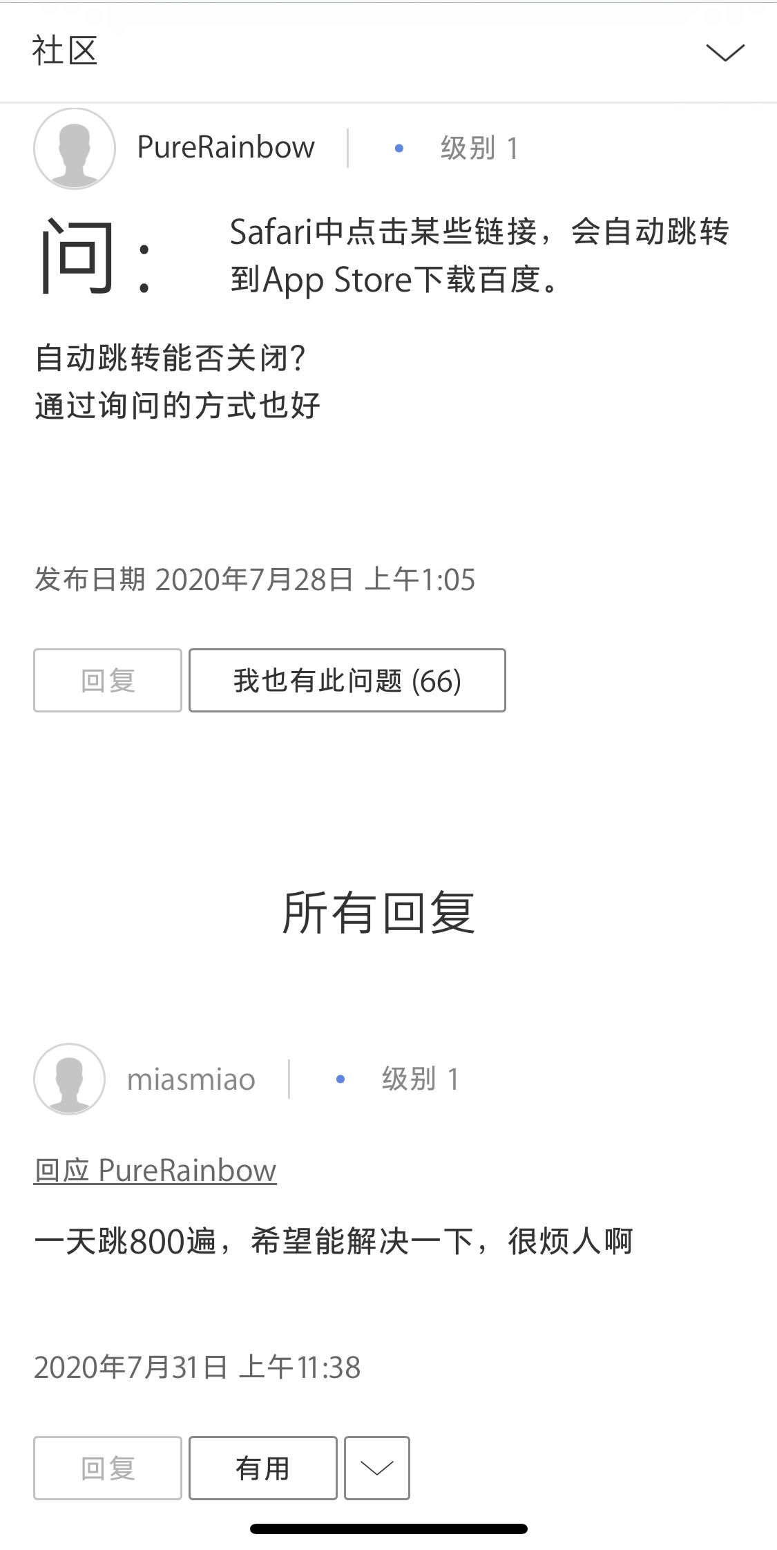 使用Safari打开百度相关网页时,无限次自动跳转到App Store的百度app下载页。一定要逼迫用户下载吗?请问用户为什么没有权限阻止这种强迫性的流氓行为?可不可以不要在使用iPhone的一个app时,猝不及防就跳转到了其它app上?无数的用户都被相同问题所困扰,问题并没有任何被解决的迹象。