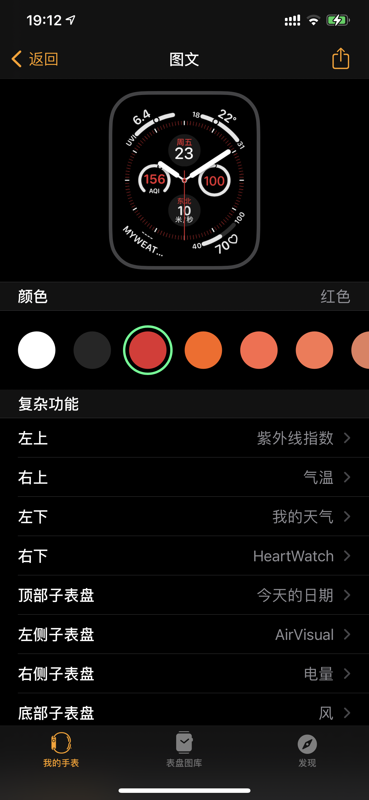我比较喜欢这种信息全面化的表盘,比如图一,在三年前这个图文表盘随着iwatch4一起推出,我喜欢他的彩色界面,之前表盘上的时刻还可以自选颜色,自从两年前的一次更新,我发现了一个问题,只有黑白两色的表盘,周围一圈的信息才能彩色显示,其他颜色的表盘会直接影响周围信息的颜色如图三所示,在这次更新前,颜色只会影响表盘内的时刻。