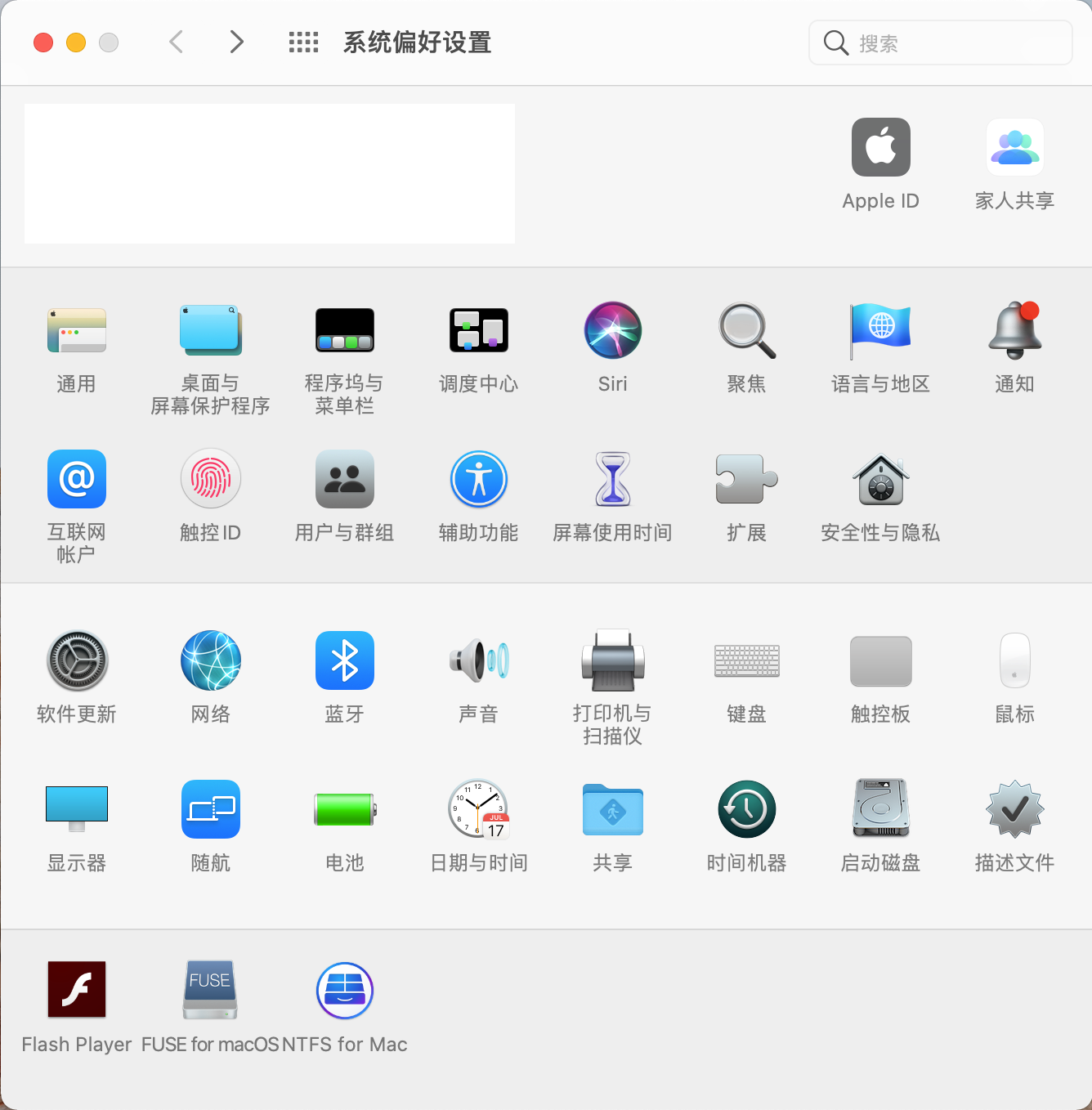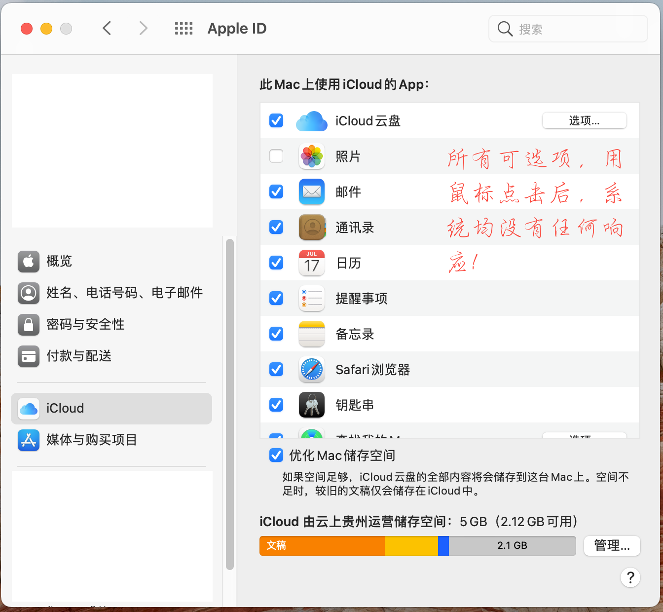 我碰到这个情况,点击进入“系统偏好设置”,点击Apple ID进入操作界面,发现该界面(如图)上所有功能选项用鼠标点击,系统均没有响应。