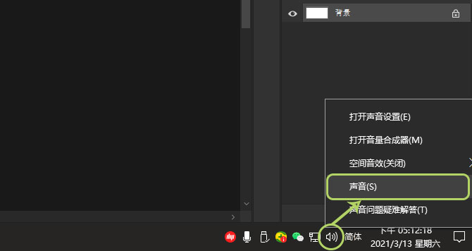 ① 在您Windows系统的桌面右下角,找到音量小喇叭符号. 点击邮件,选择[声音]; 步骤如下图