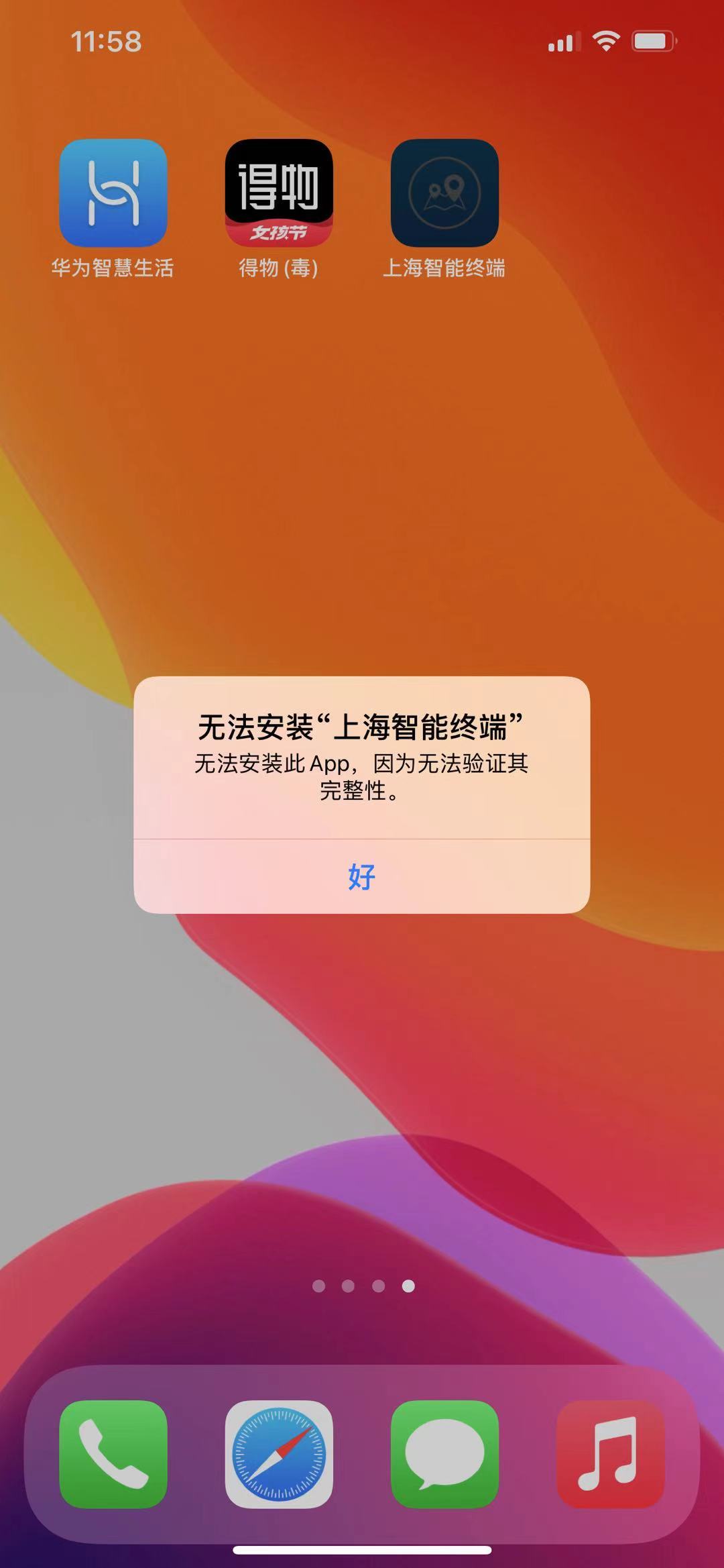 建议联系公司 IT,这个提示通常是 App 的签名证书有问题。