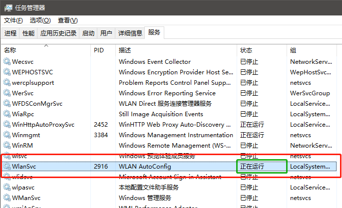4. 找到WlanSvc,您看看它的状态,当前应该是[正在运行]