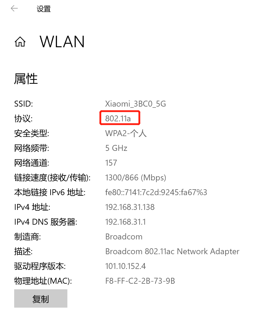 5:路由器wifi协议为802.11.ac(wifi5) ,win10系统只识别到802.11.a(wifi4)