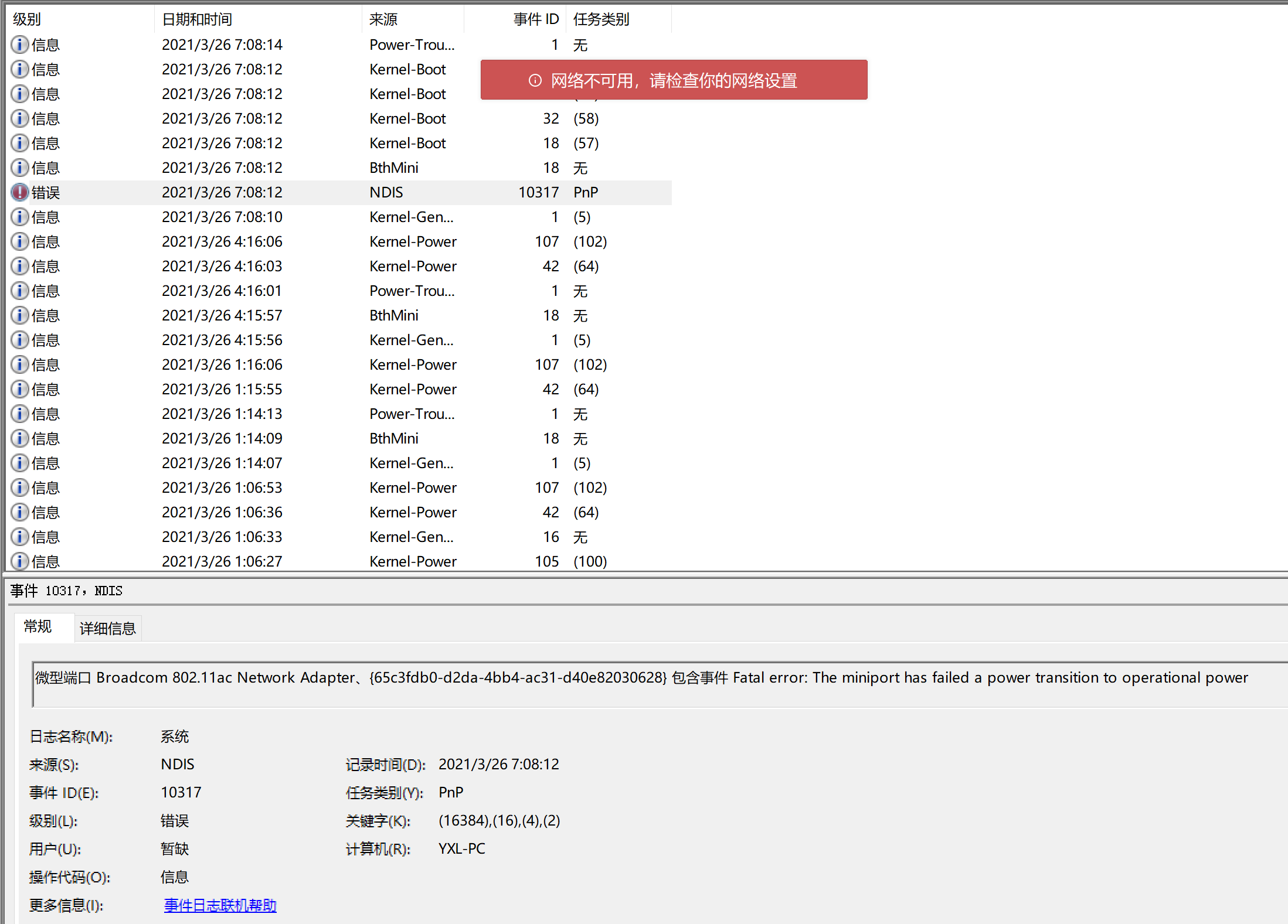 MacBook Pro16用win10睡眠后唤醒,不能连接wifi,系统不能识别Broadcom网卡硬件,每次需要重启才能解决问题!