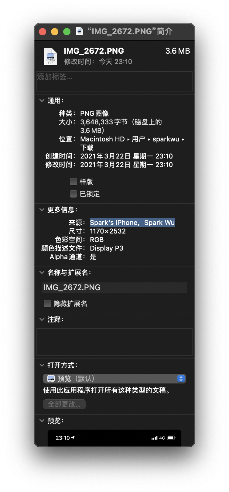 Mac 可以在文件简介里面看到来源的设备名称,iPhone 没办法。