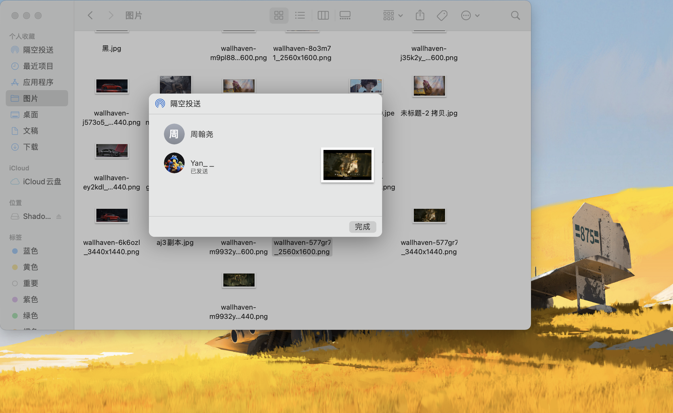 我的设备也遇到这个问题,MacBook Pro通过AirDrop到手机的话桌面弹窗就会跳到左上角且出现卡顿无反应的情况,但不影响设备其他软件运行,完成按钮不能点击,只有重启设备才会消除AirDrop界面或者一顿乱操作不经意的才会消失。