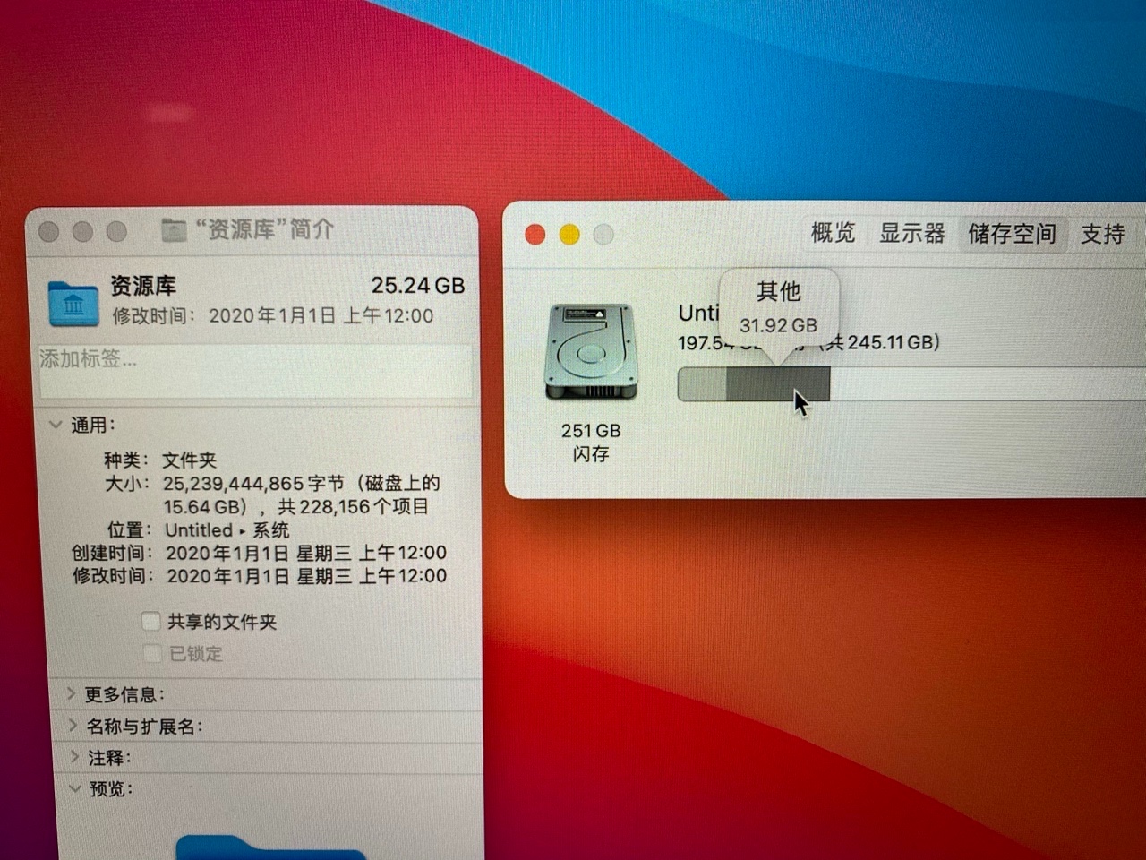 我根据苹果官方的重装教程重装系统后闪存容量减少,其他卷宗占了32个G(重装前是10个G),系统文件里资源库文件夹有25个G,怎么解决?