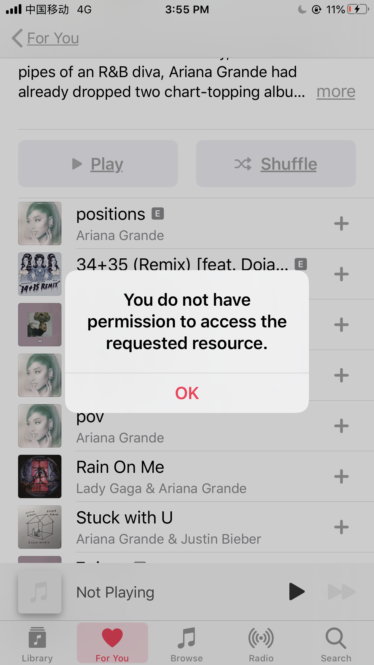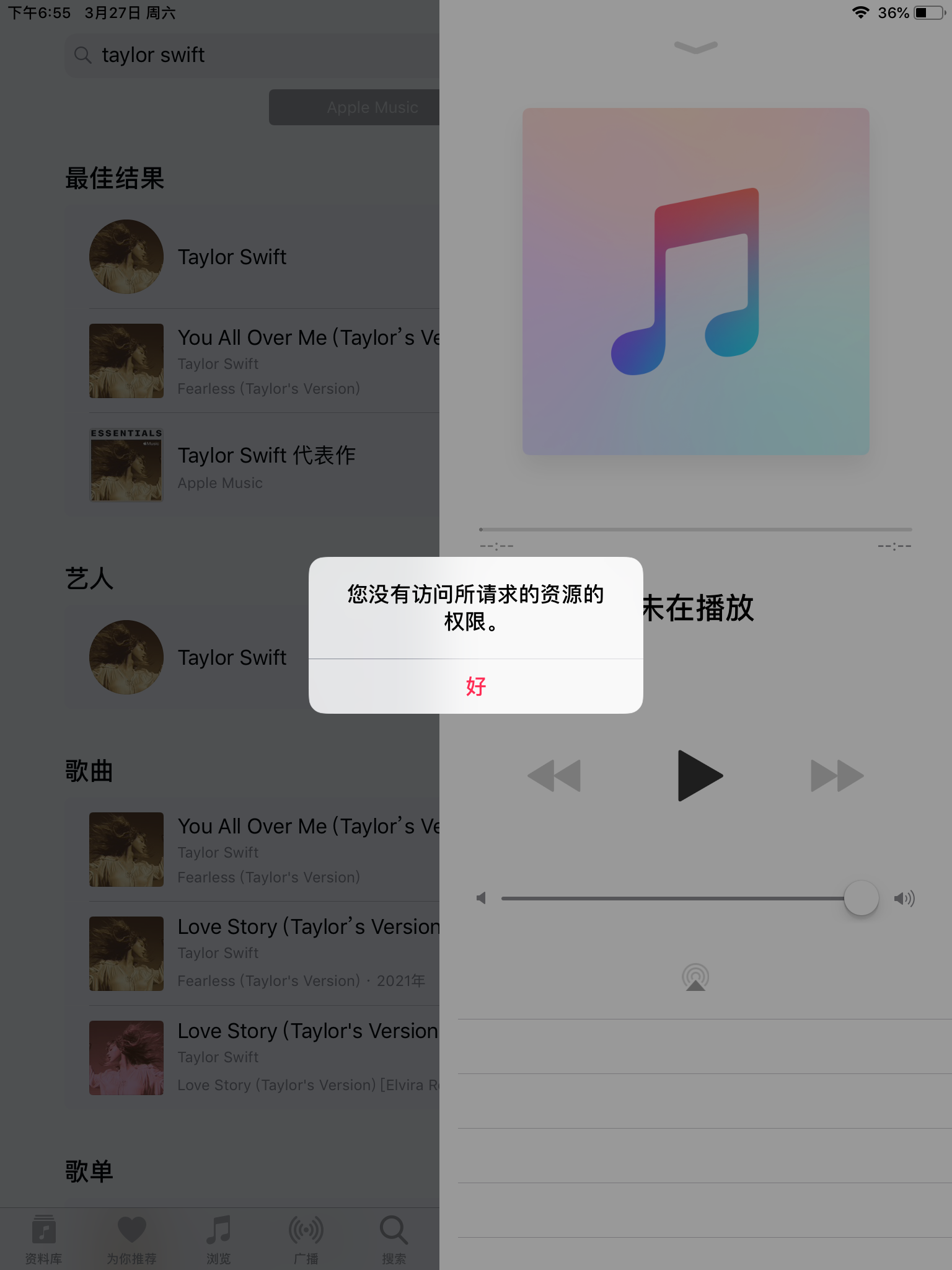 在手机端用apple music听歌,提示显示"you have no permission to access this requested resource" 我难道不是已经付费了吗?怎么就没有权限呢?