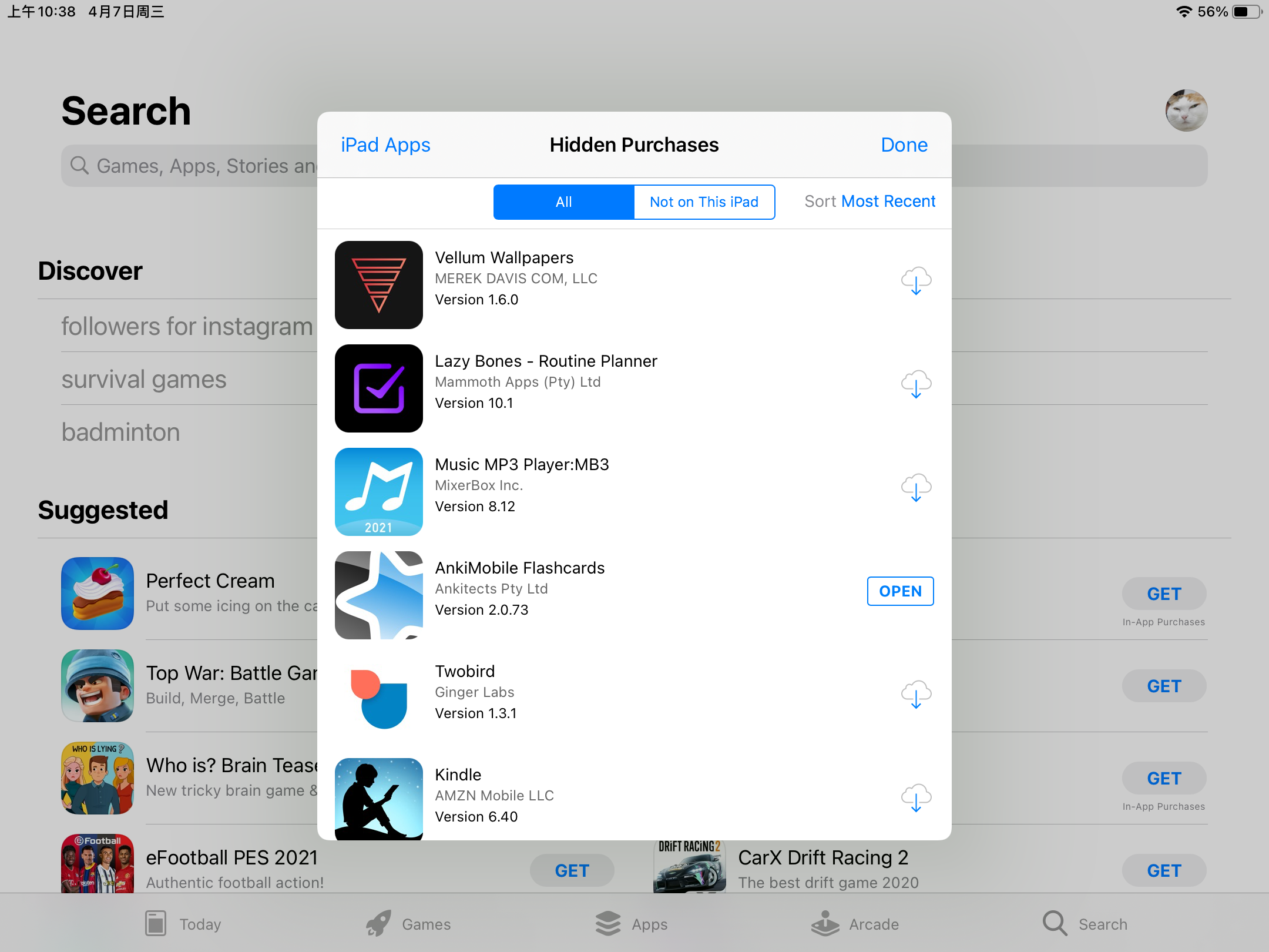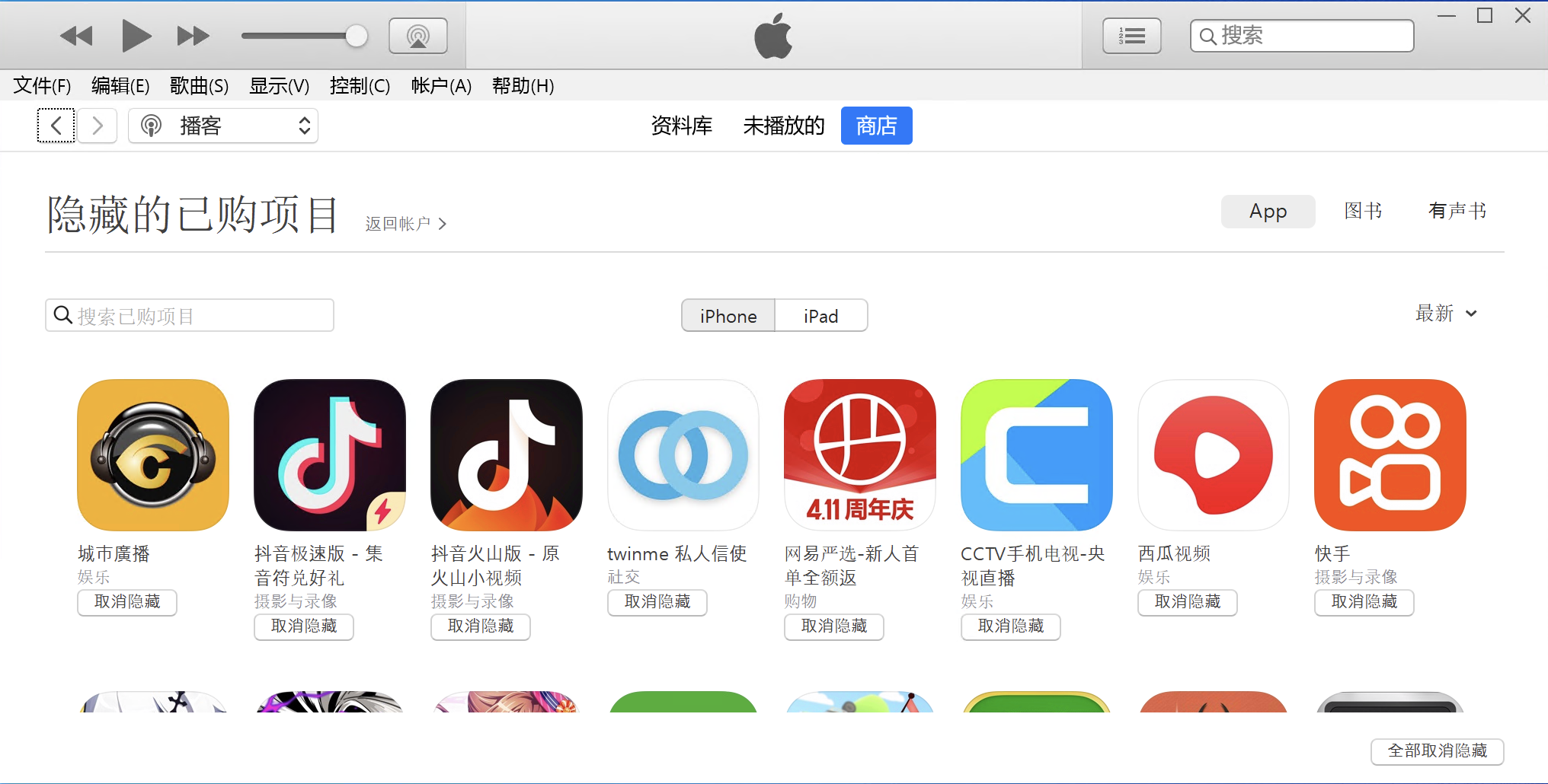 在hidden purchases 里找到了,我记得没隐藏过任何app啊 怎么取消隐藏?