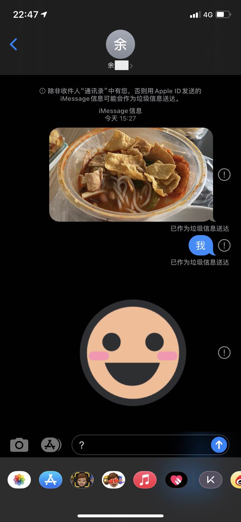 2.给别人发信息,如果他先发给我,我可以正常发信息,如果我先发,经常被提示作为垃圾信息送达,因为是用我的apple ID发送的,必须要别人加了我的好友才行