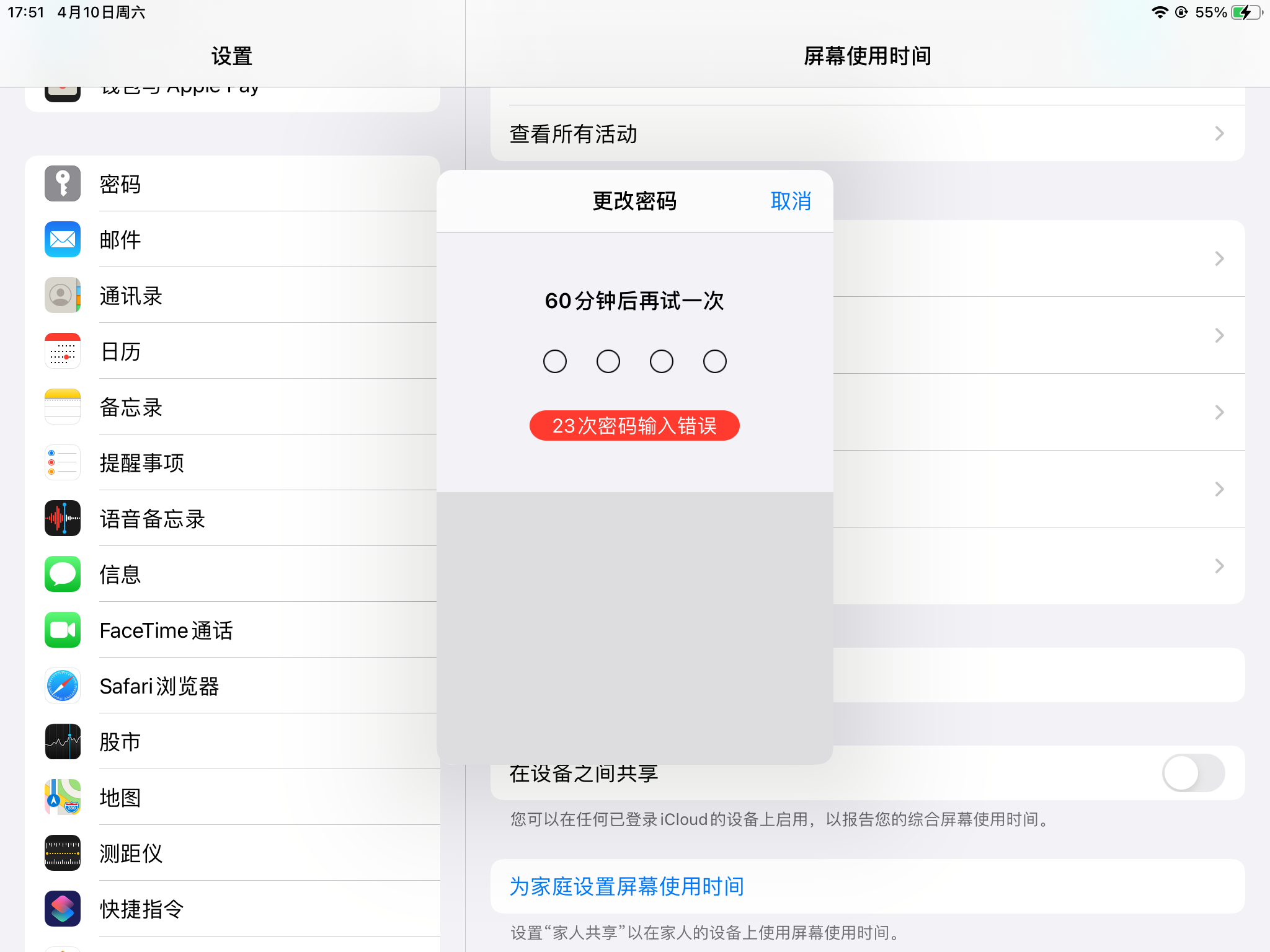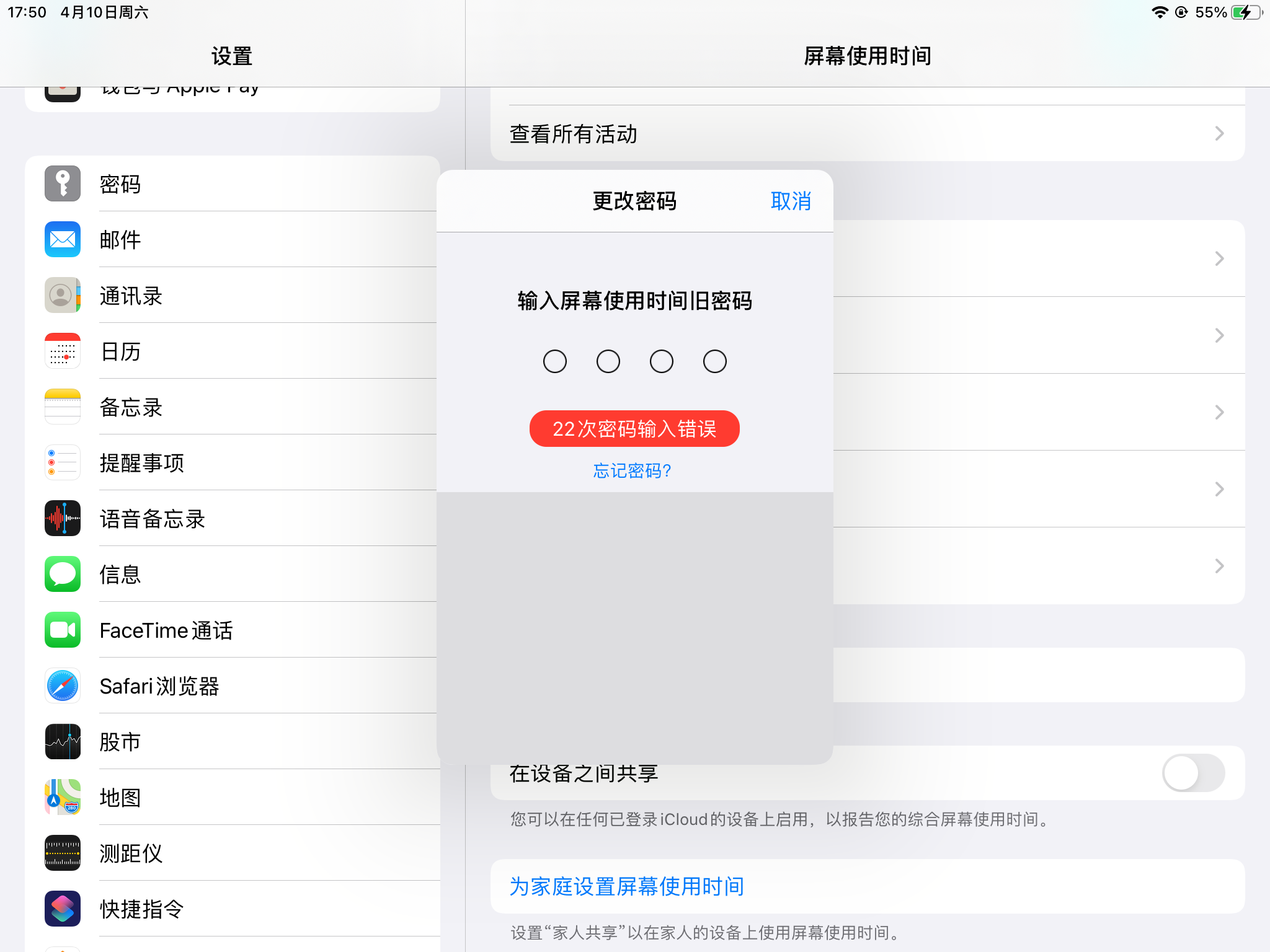 我想更改屏幕时间,可是每次让我输入appleid我输完之后他又给我重置了一次次数,就好像输入失败一样
