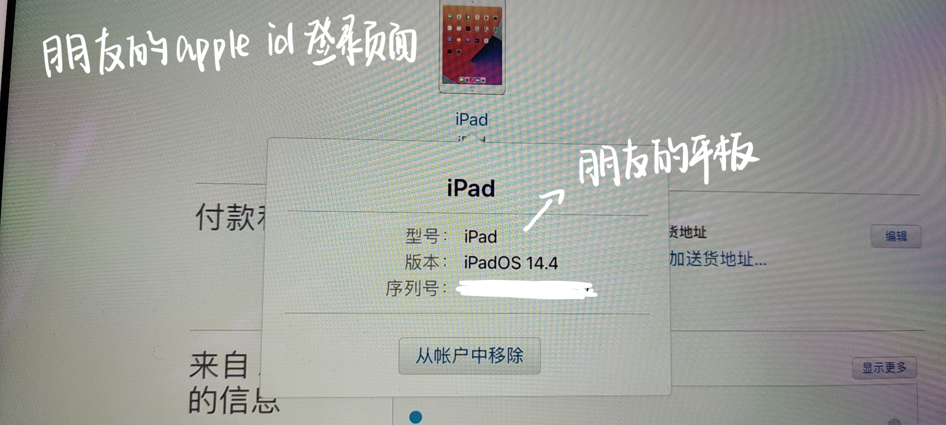 之后隔三差五又时不时弹出朋友的id验证请求,要求输入她的账号密码。上网查找了解决方法,但是依旧没有用。让朋友在官网的隐私条目中的设备一栏移除我的ipad,朋友登录后发现设备一栏只有她的ipad,没有我的。