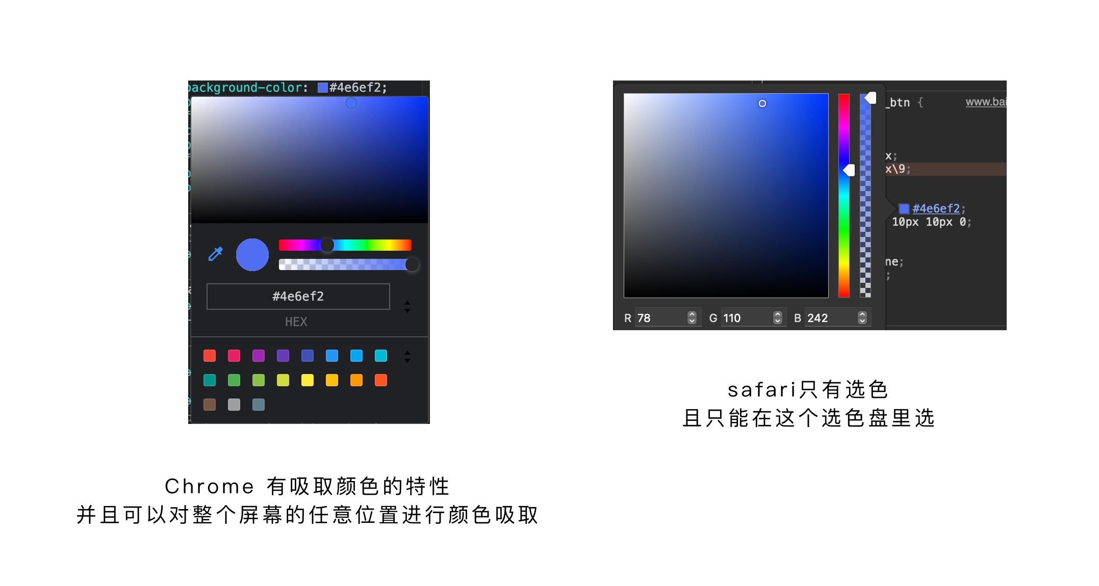 safari 现在支持的审查元素中,在css部分的取色,仅仅只能对取色盘进行选色,而不能对网页区域的任何位置进行吸取颜色,我们在拿safari做开发的时候,比如一个很简单的操作,我想取logo上的一个颜色,safari就完不成。