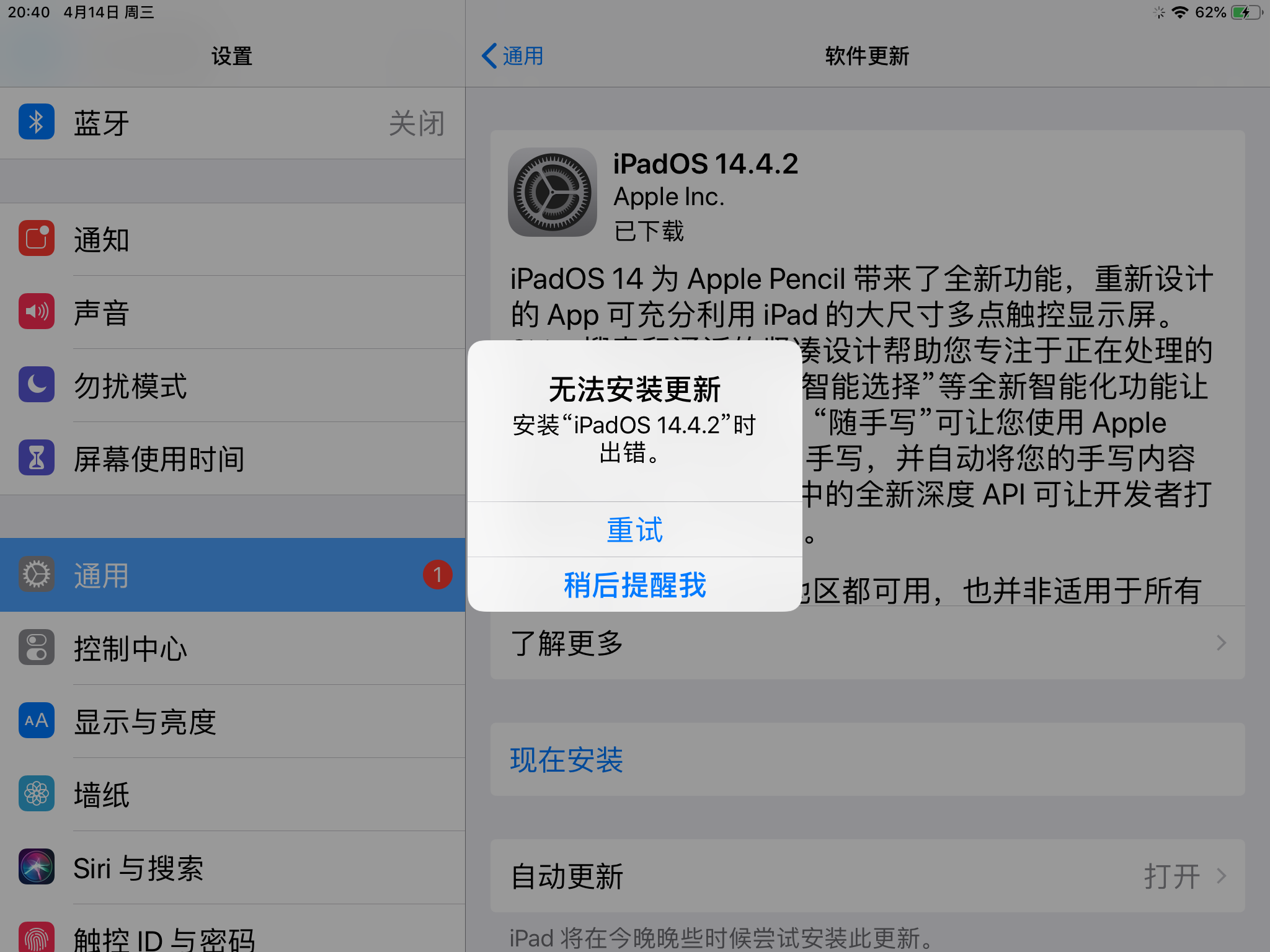 我在把iPad更新到14.4.2时,已经下载完了,点现在安装的时候总会显示无法安装更新,这该怎么解决?
