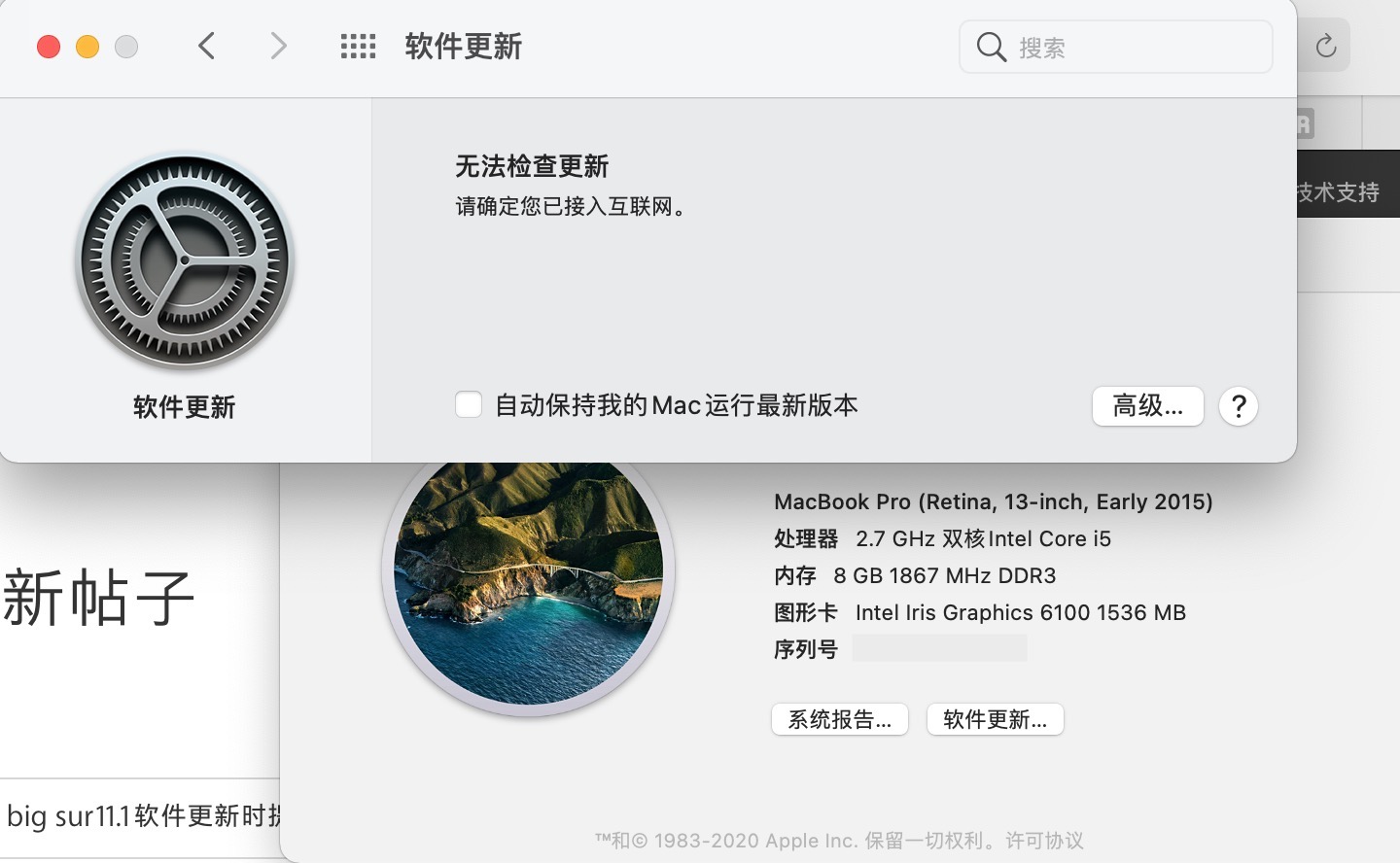 mac os big sur11.1软件更新时提示“无法检查更新,请确认您已接入互联网”
