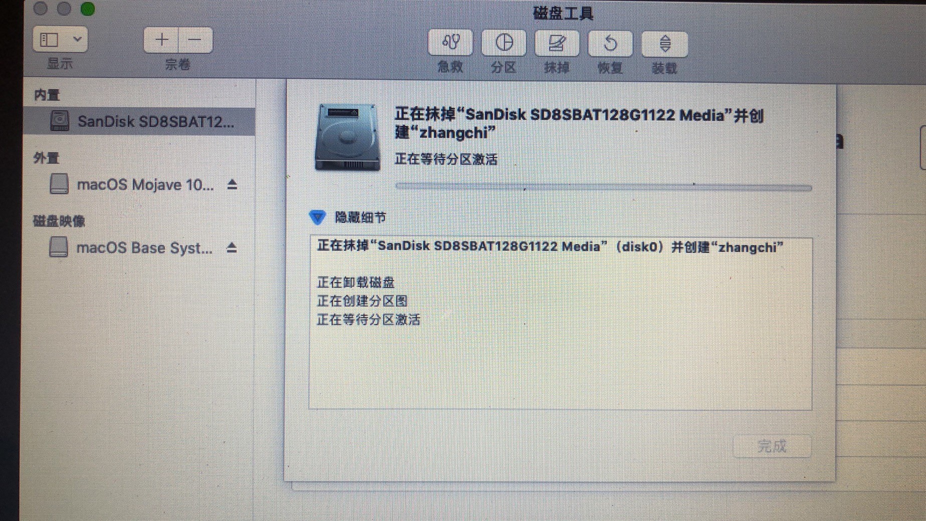 我制作了mojave的安装U盘,从U盘启动安装,用磁盘工具抹固态硬盘,一直“正在等待分区激活”。