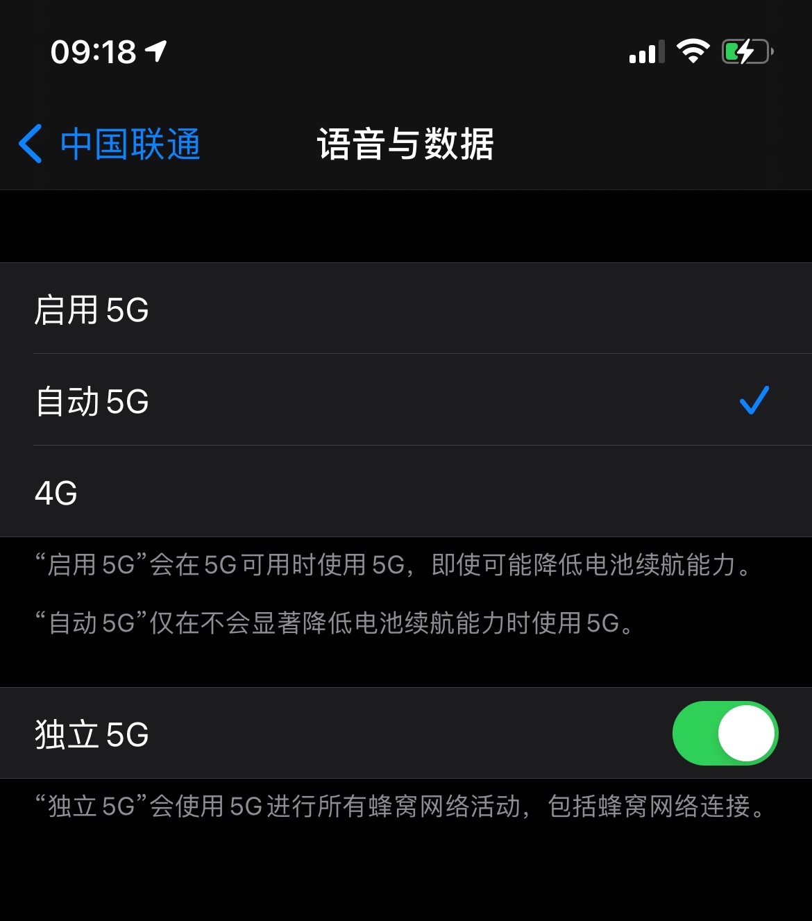 设置里面的“独立 5G”就是部分运营商所说的 SA。打开之后就能同时支持 NSA 和 SA,关闭了就只能支持 NSA