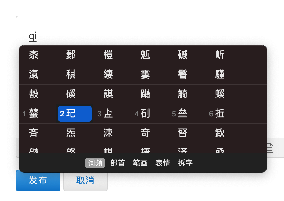 MacBook输入法中有一些生僻字字用拼音打不出来,比如𤣱qi,三声,但是用拆字又有,这个问题如何解决呢?