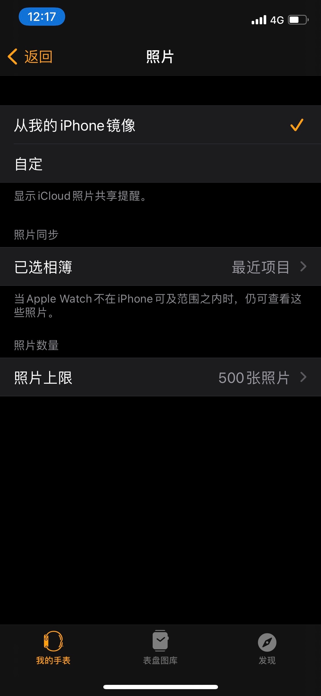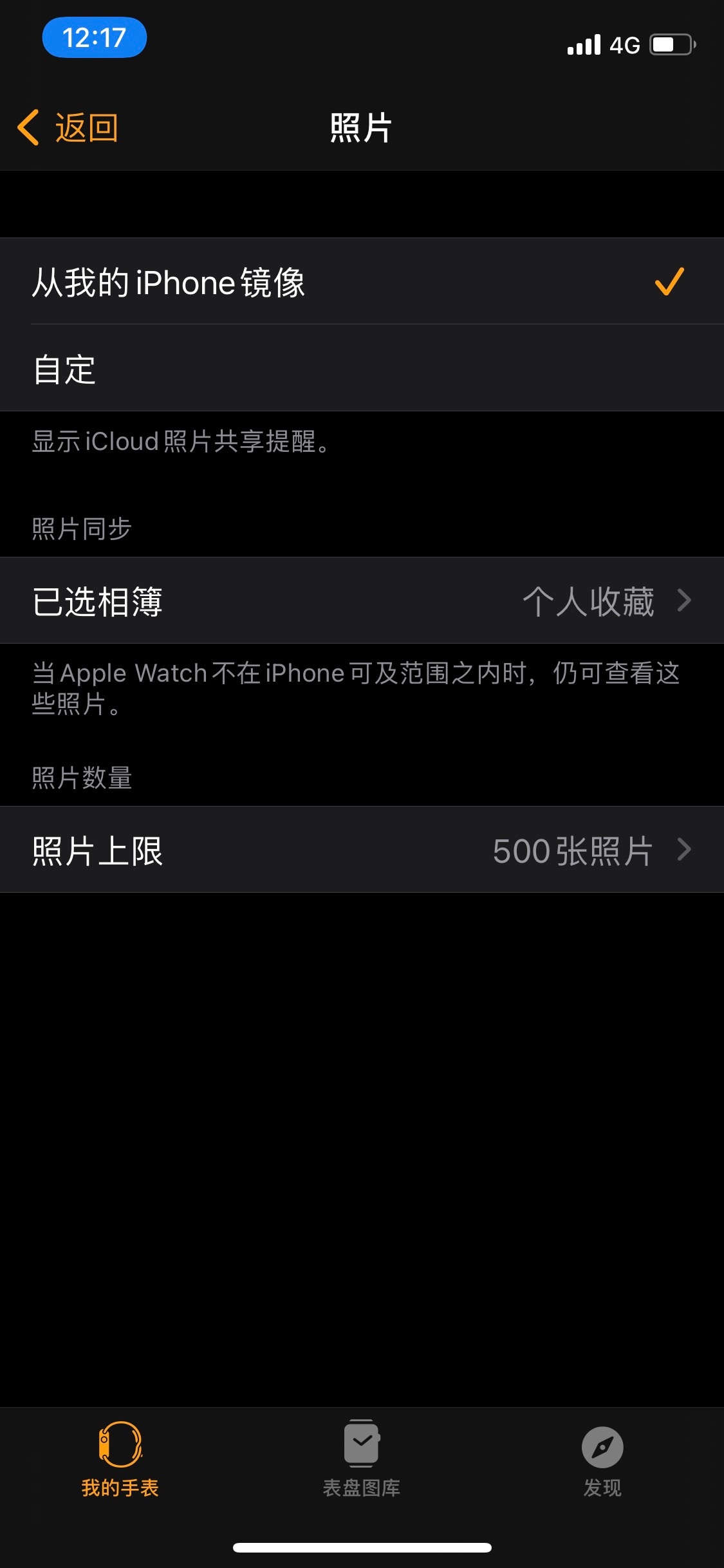 就设置同步最近项目,但是iwatch上没有同步显示一直提醒我选取相册,后来换了收藏也还是不行,前面是iwatch的画面后面是手机设置t