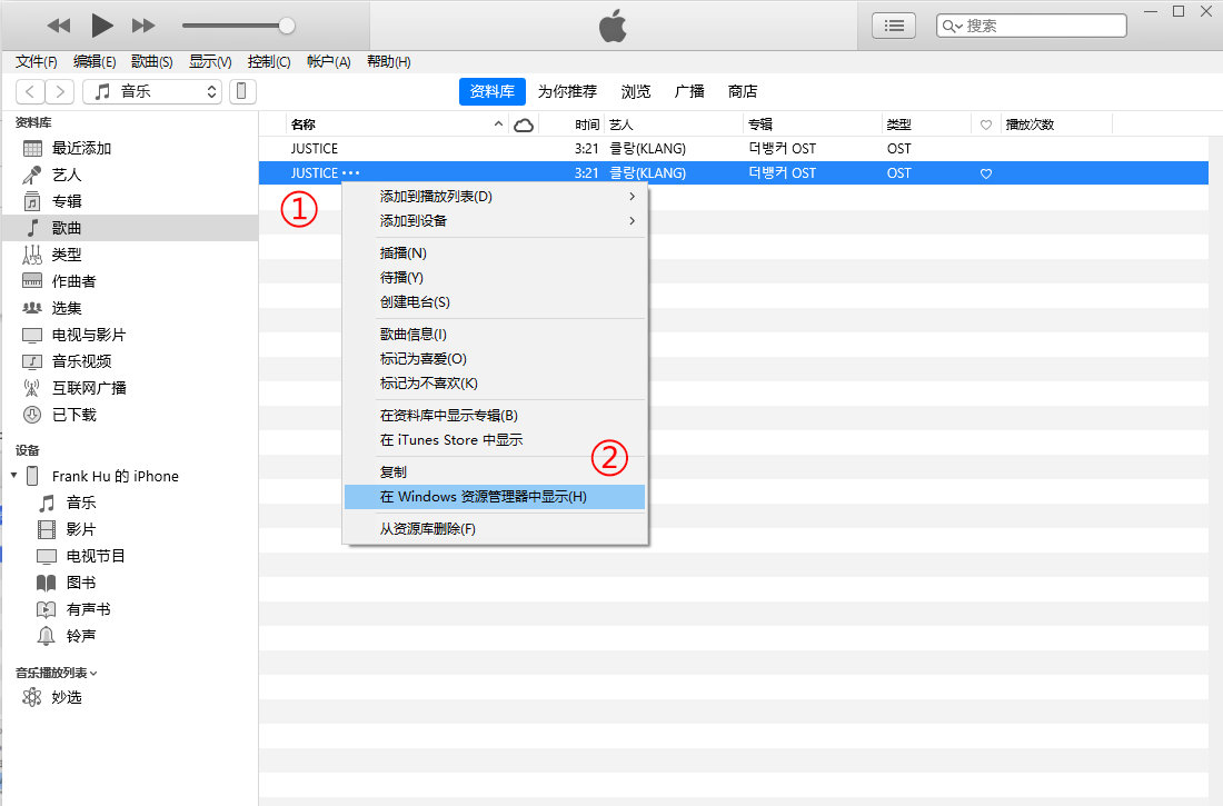 1,首先将想制成来电铃声的音频文件拖入 Itunes 的“歌曲”资料库中