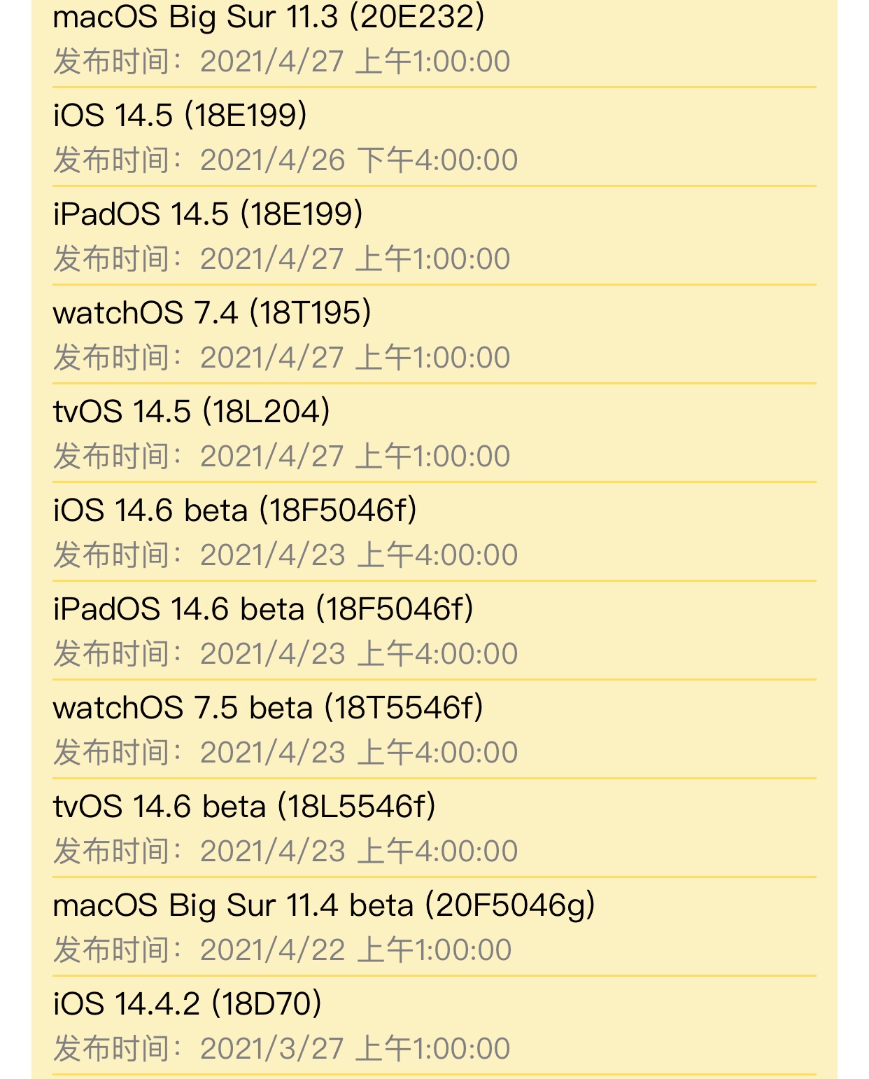 以下用户的用户个人资料: 秦超 秦超 用户级别: 级别 2 291 积分 2021年4月28日 下午9:44 回应 小悲伤 你好,iOS目前最新软件版本为14.5,再次之前的系统是14.4.2,发布于3月27日,详情见图。 回复 链接