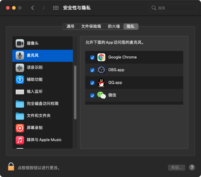 一般来说,应该是在隐私系统偏好中的麦克风中,微信没有被准许造成的,也就是如下图,微信必须被打钩选择上