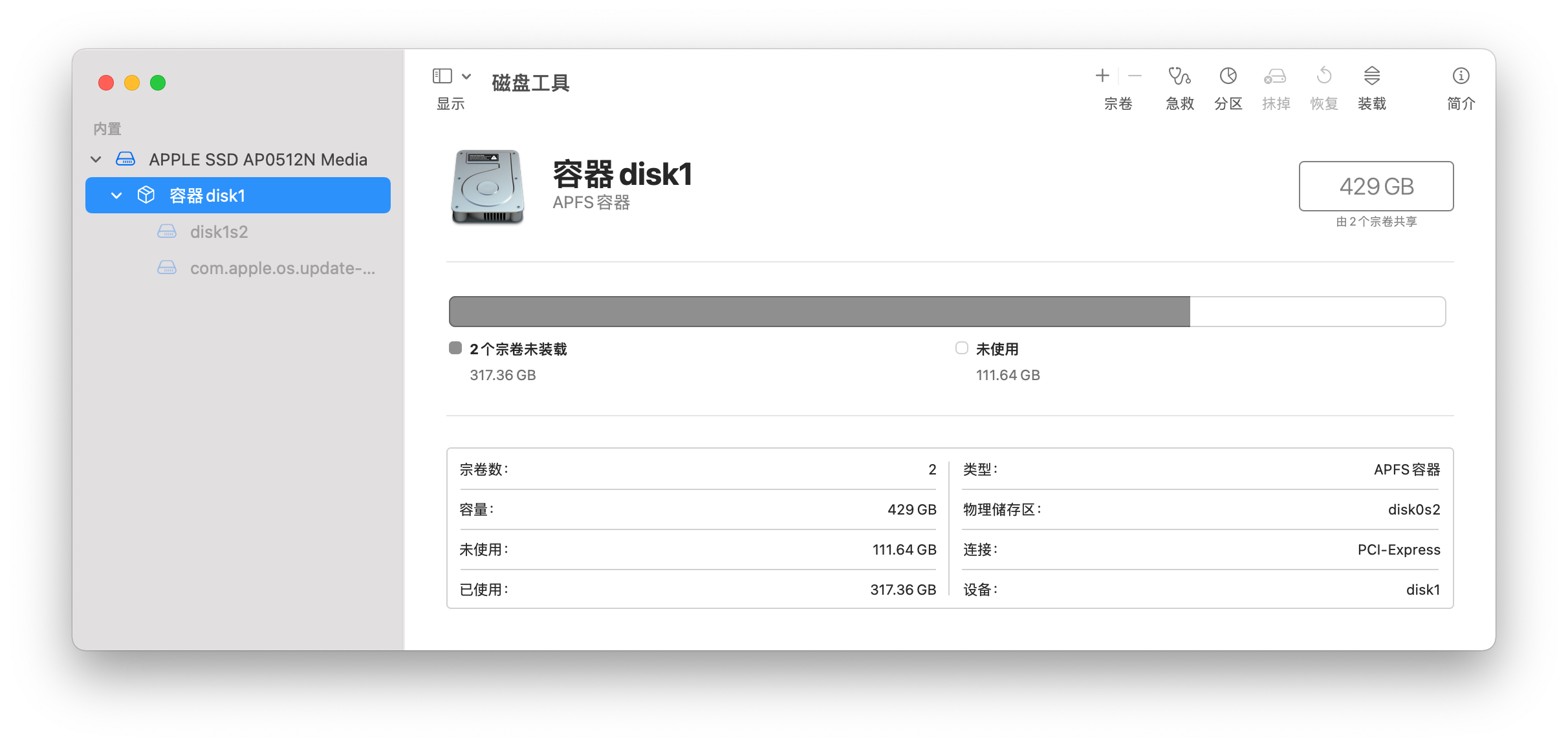 重启后,运行下 diskutil apfs list,看看是否能看到具体的信息。
