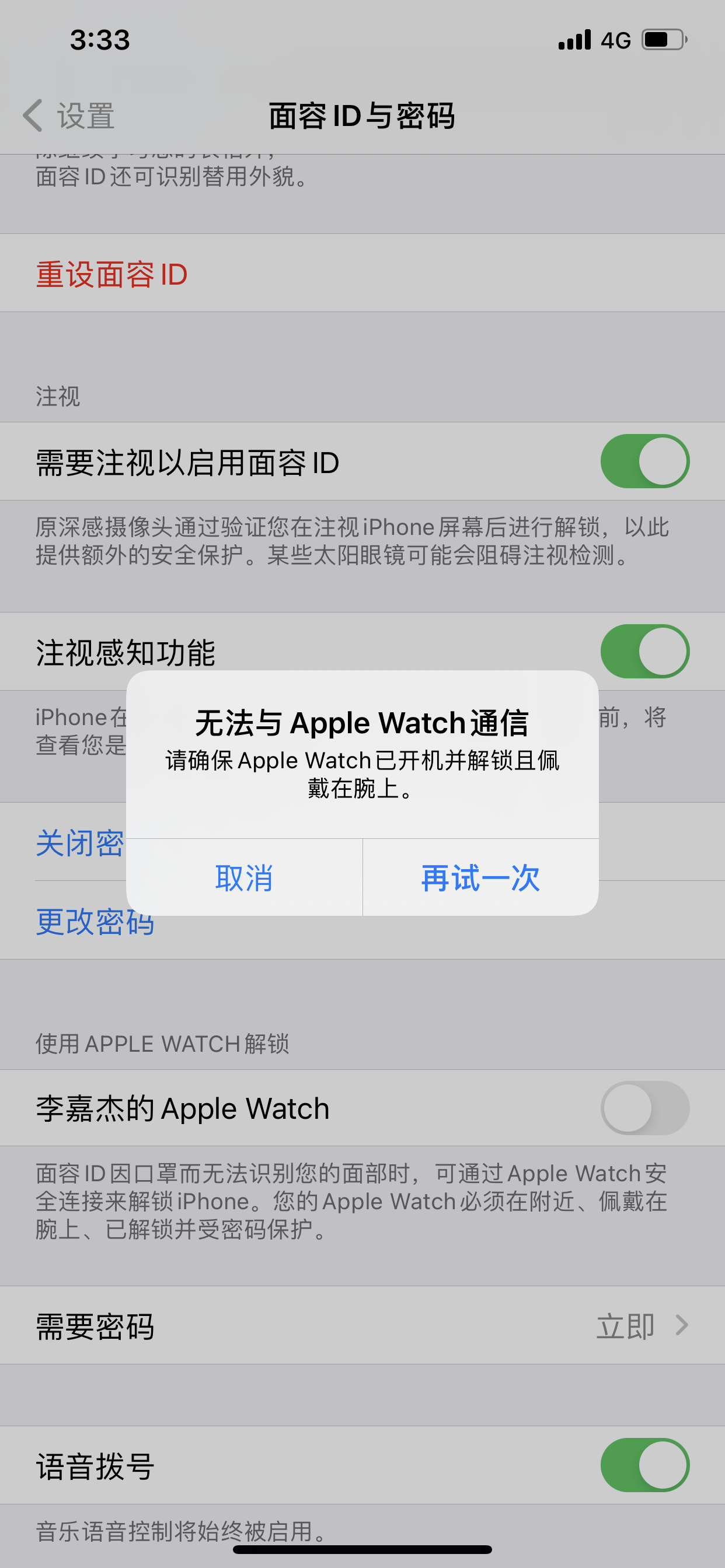 iwatch和手机更新到最新系统后,用手表解锁面容,提示出来iwatch无法通信