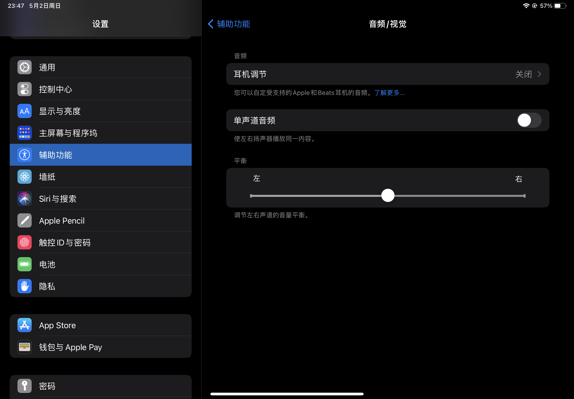 导致iPad声音外放时,不管横屏还是竖屏都是左侧声音比右侧大,看过拆机,摄像头一侧的扬声器确实更大也更靠近扬声器开孔。后续希望通过系统更新平衡两个扬声器声音大小,或者在辅助功能的音频中,把左右声道的平衡调节分的更细,最好可以无级调节。