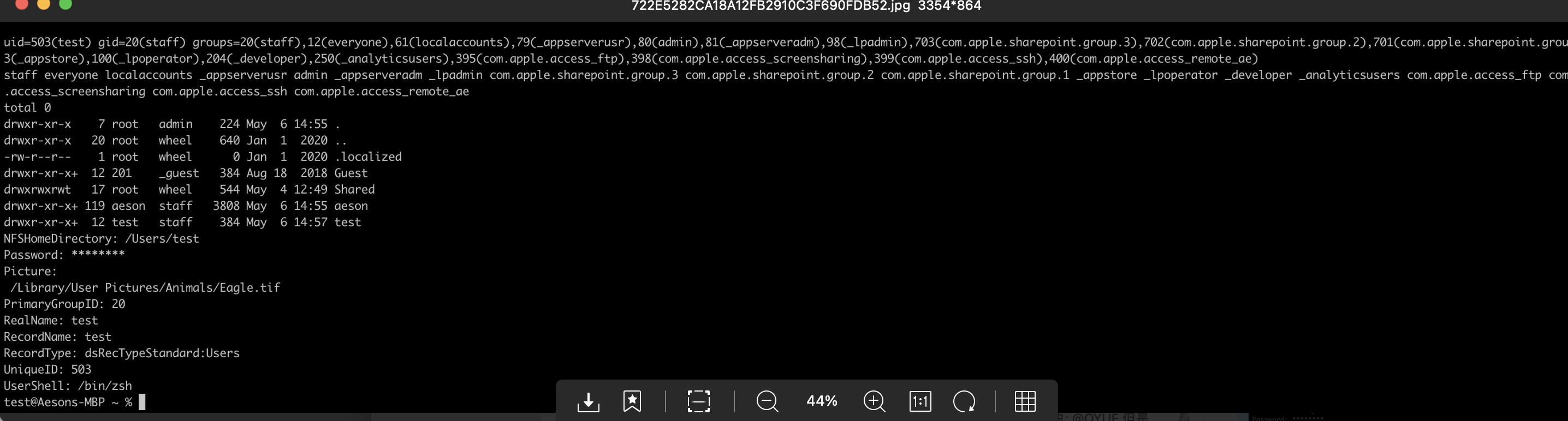 在当前用户和新建的那个账户中,输入在终端中输入姓名的命令,并保存/记录/贴图下显示的内容以备后用: