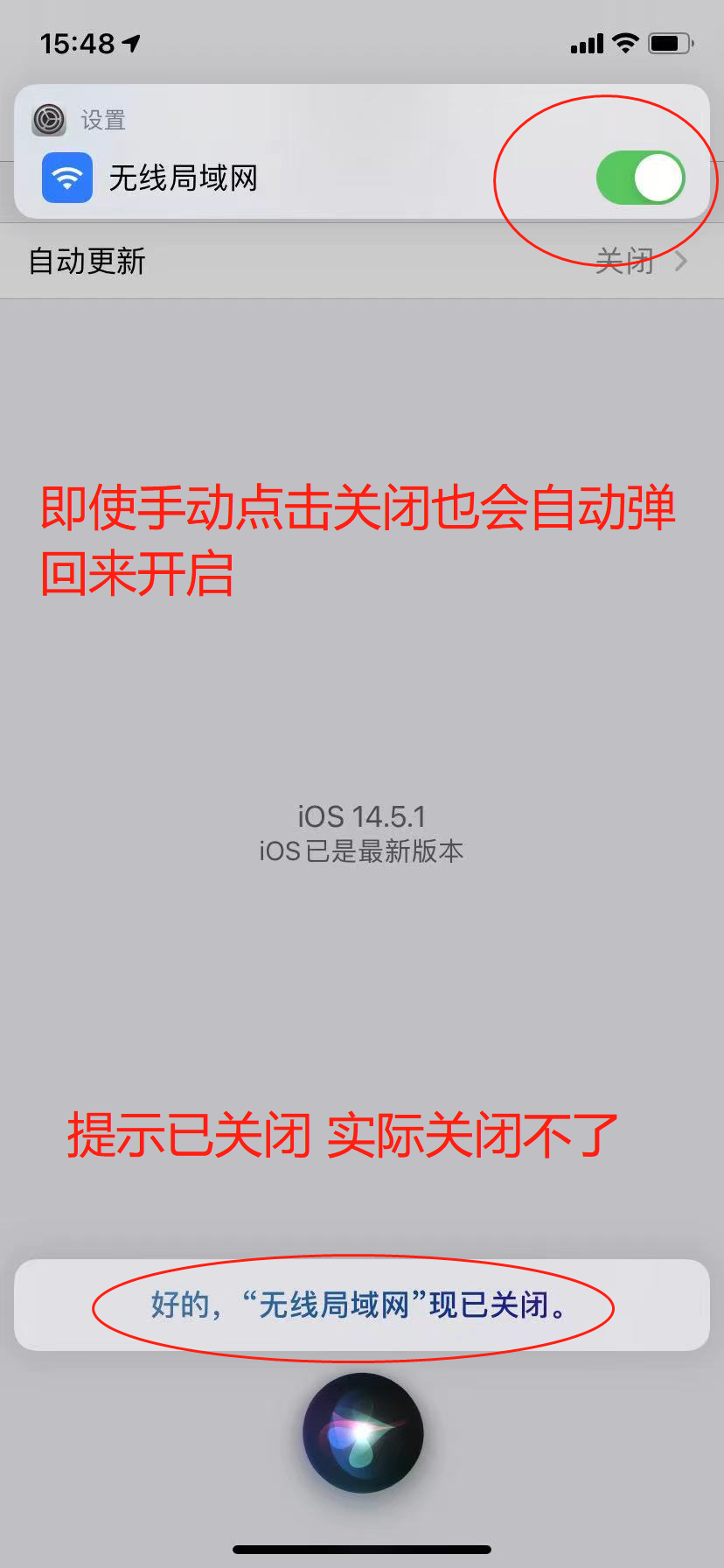 3.告诉Siri关闭无限局域网,Siri会提示已关闭但关闭按钮会自动弹回来自动开启,手动点击也无法关闭,会自动弹回开启(如下图)。因下拉菜单无法完全关闭网络,进设置关又很麻烦,所以Siri在这方面就很便利了,但现在也无法使用了。