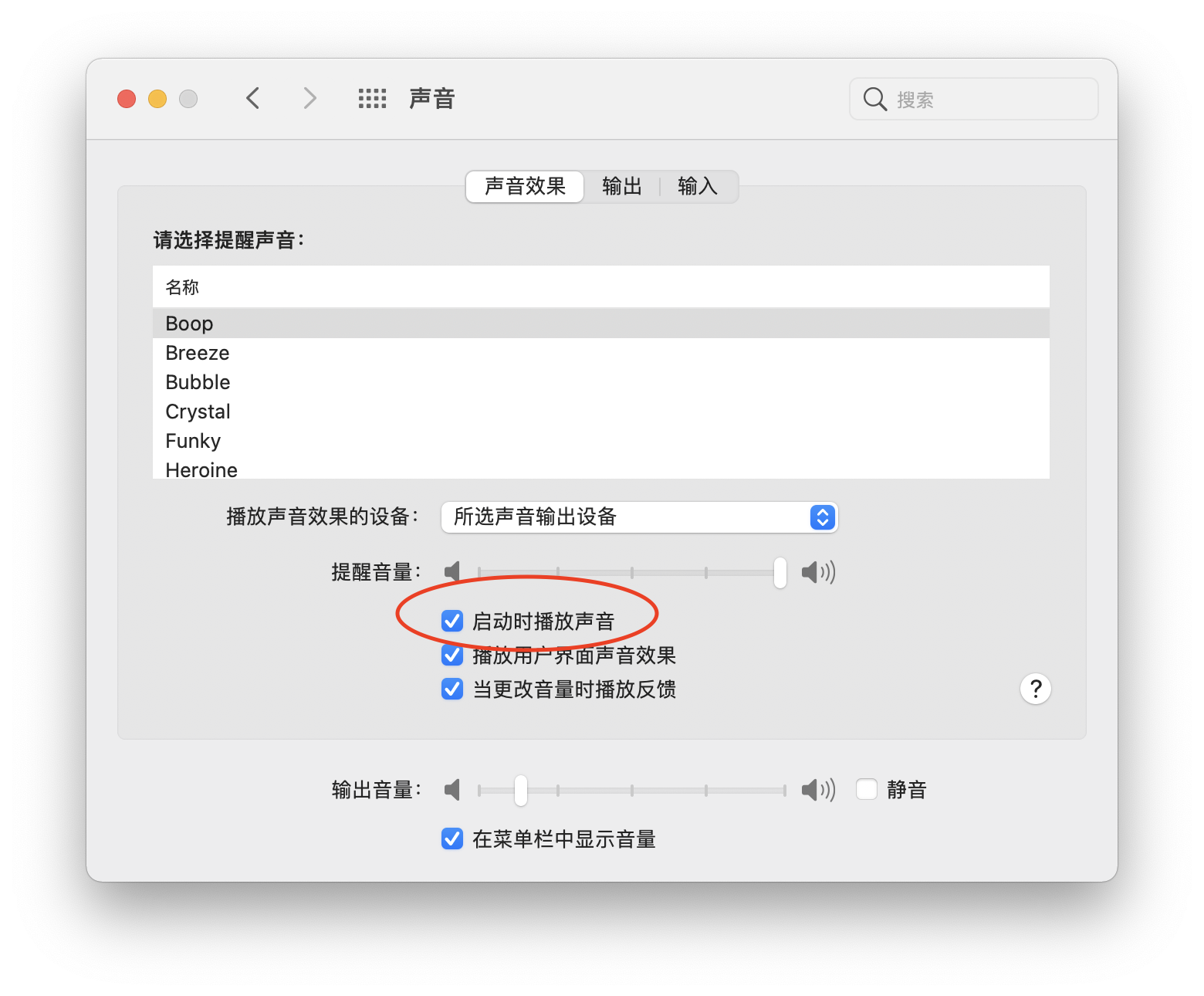 我在 系统偏好设置-声音-声音效果取消选中“启动时播放声音”,那么按道理开机声音应该就被关闭了。