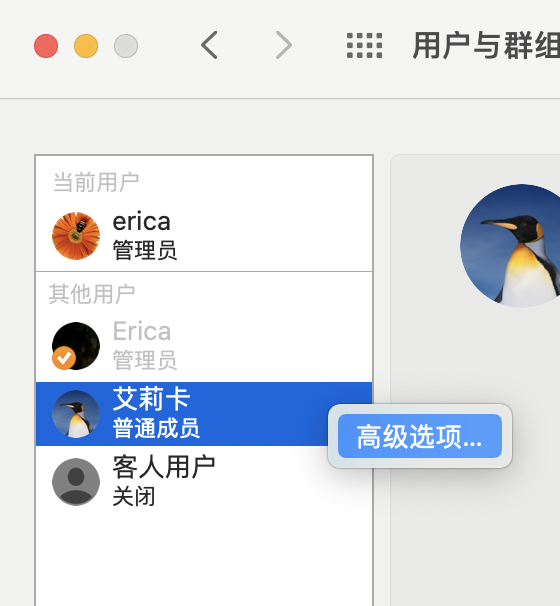 如图,系统偏好设置-用户与群组-高级选项,账户名称那里是灰色的改不了。然后按照提示,按住control再点按其他用户也没有高级选项的提示。