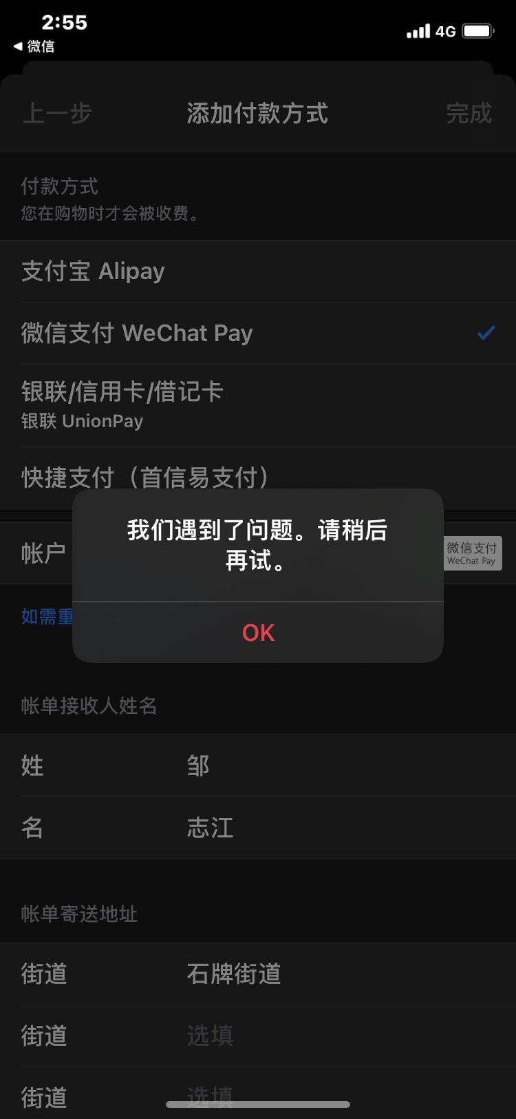 apple music添加支付方式点击完成,系统显示我们遇到了一些问题