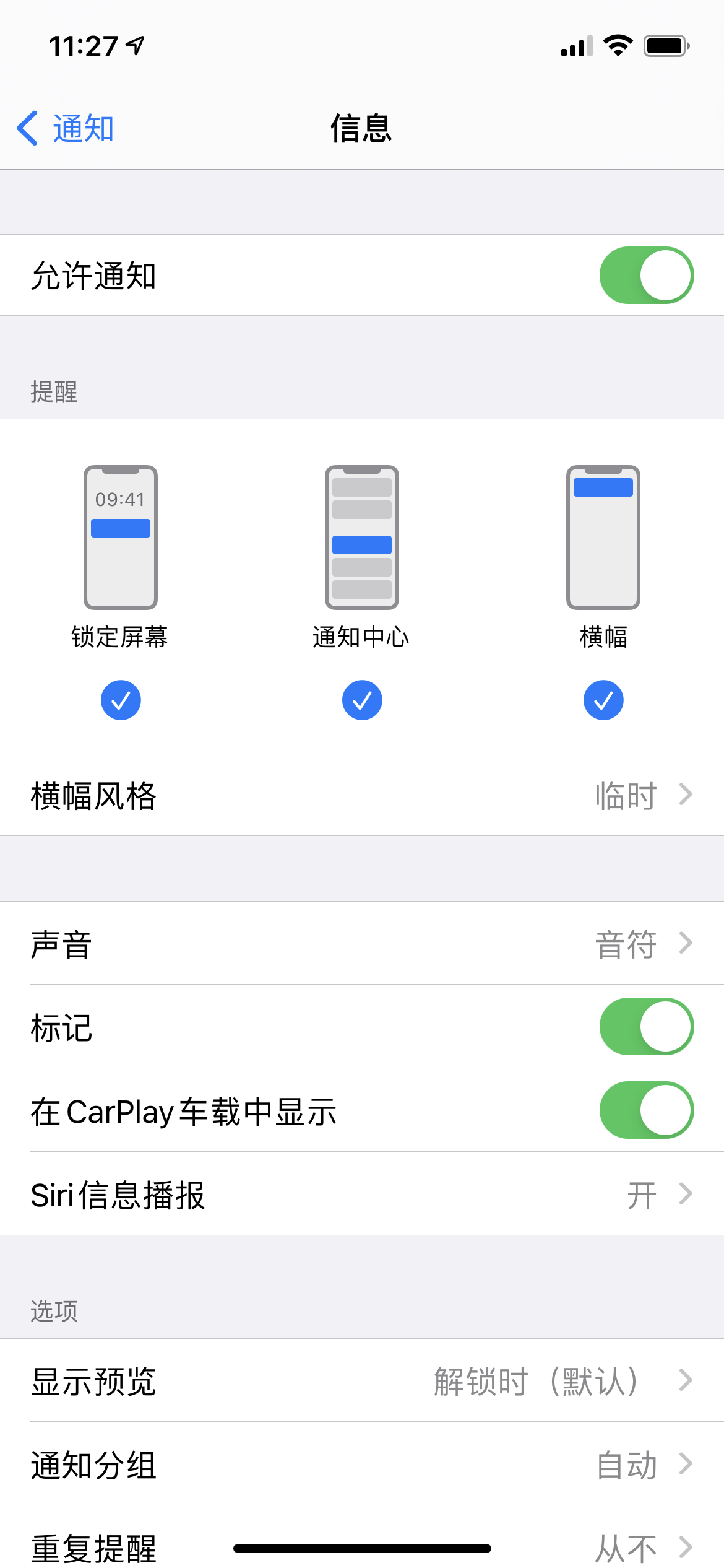 通知的设置不是直接在设置-信息中进行,而是在设置-通知下的「信息」中进行。