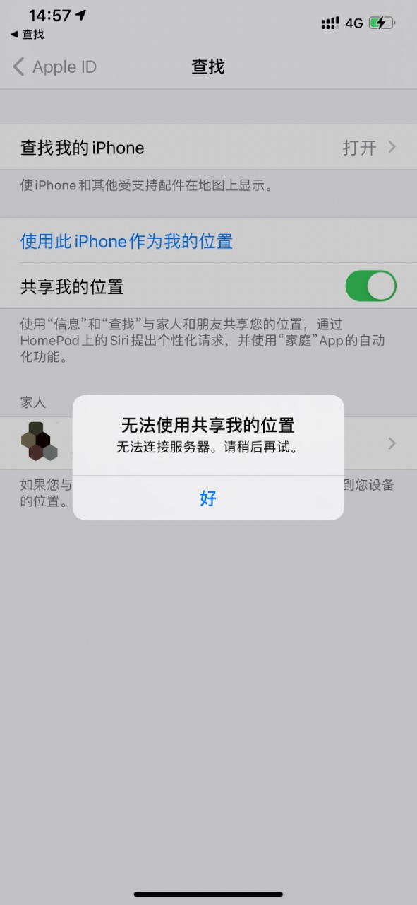 给查找启用iCloud的时候,会显示无法使用共享我的位置(无法连接服务器,请稍后再试)。