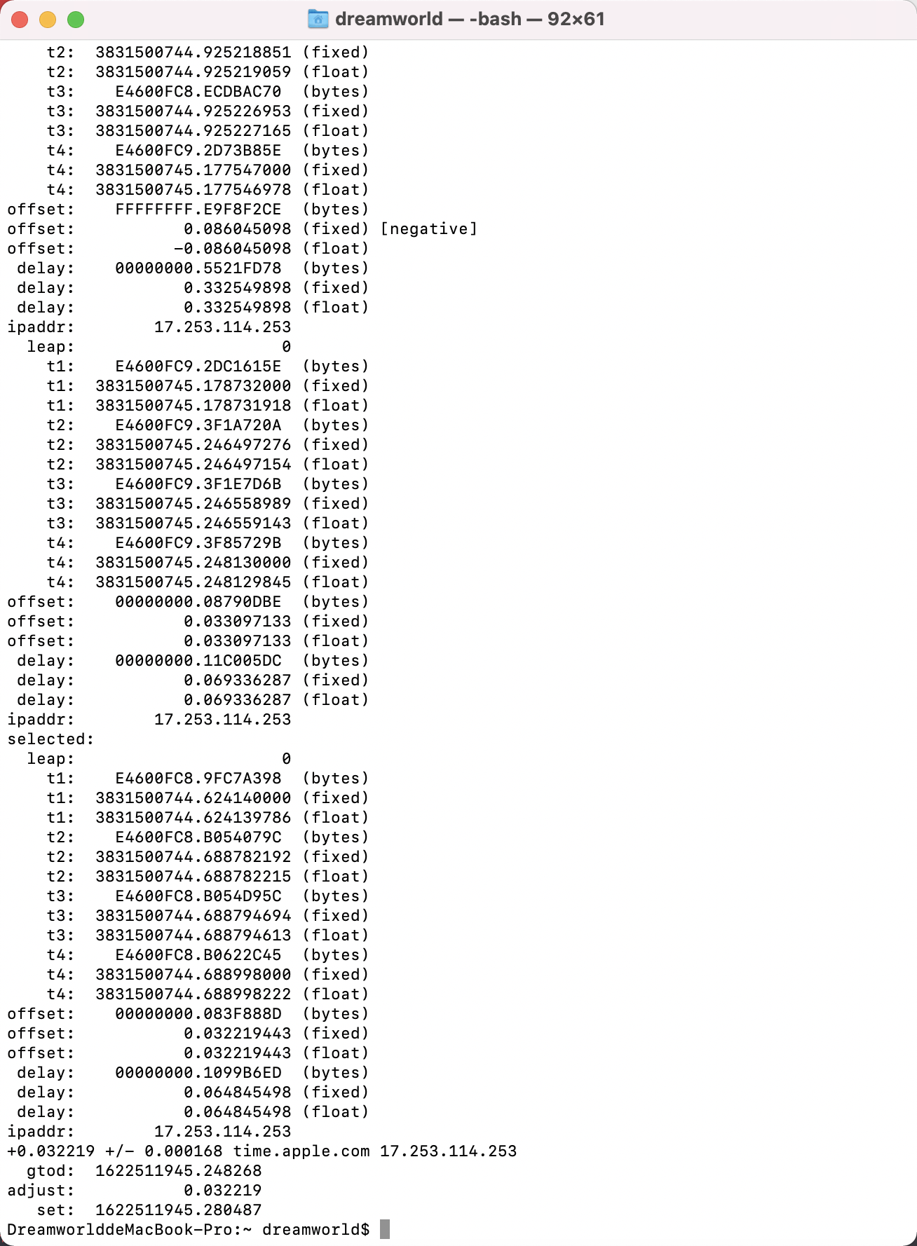 如果使用的是正确的 time.apple.com 作为时间同步服务器的话,最后那个输出的 1622512384.239782,转化为本地时间是: