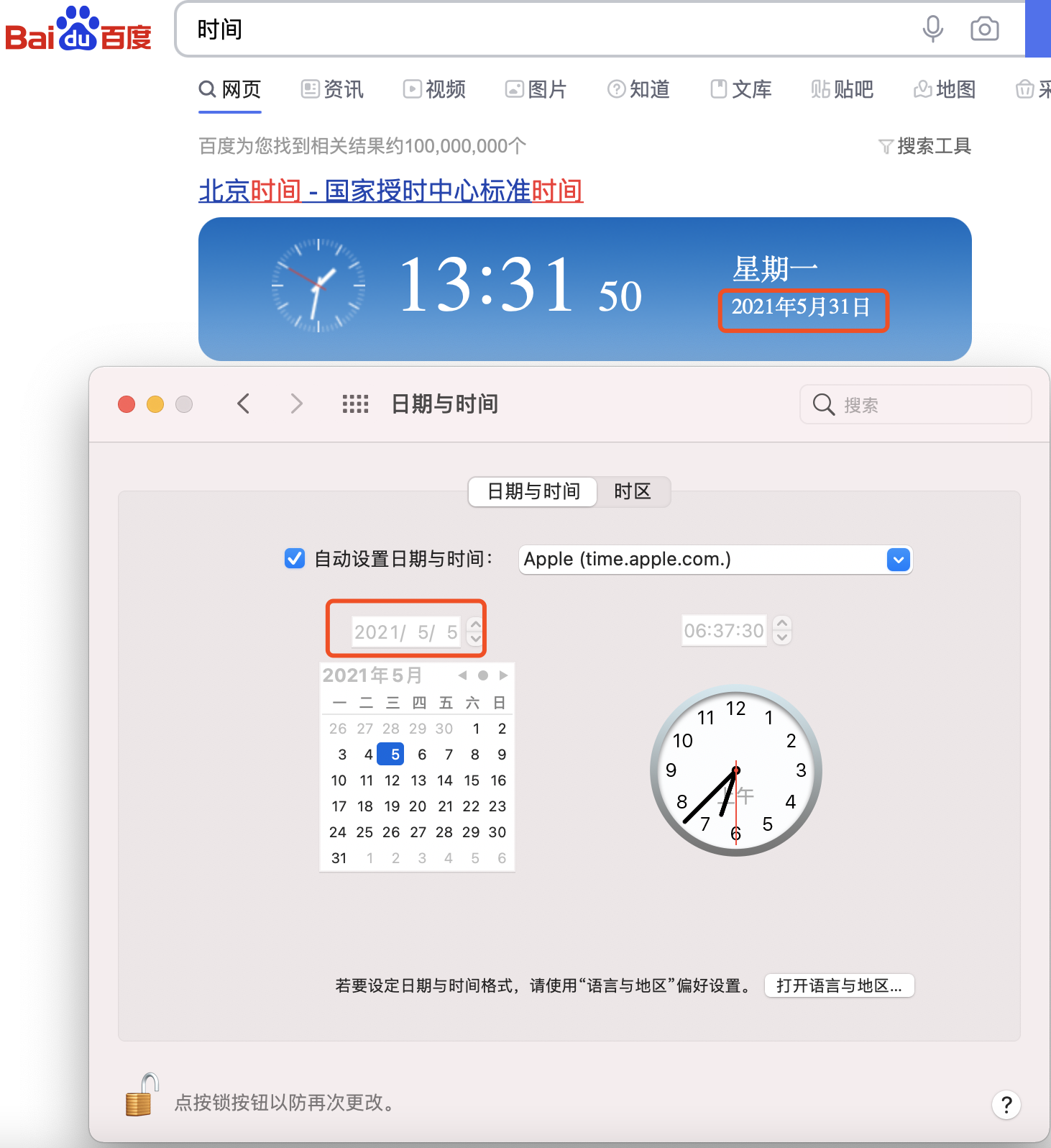 这是设置为使用time.apple.com 作为时间同步服务器的date结果