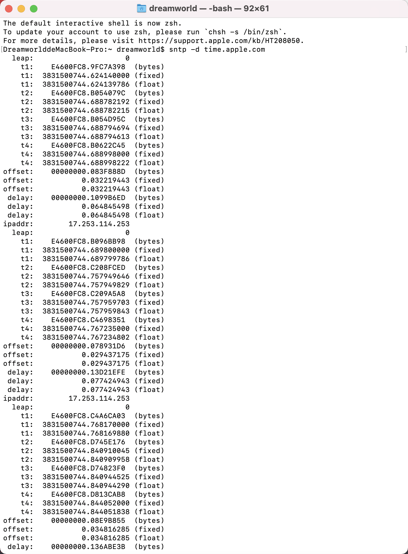 DreamworlddeMacBook-Pro:~ dreamworld$ sudo -- sh -c 'systemsetup -setusingnetworktime off; touch /var/db/ntp-kod; sntp -Ss time.apple.com; printf "Current Date&Time(NTS=Off): %s\n" "$(date)"; sleep 3; systemsetup -settimezone "Asia/Shanghai"; systemsetup -setnetworktimeserver "time.apple.com"; systemsetup -setusingnetworktime on; printf "Current Date&Time(NTS=On): %s\n" "$(date)"'