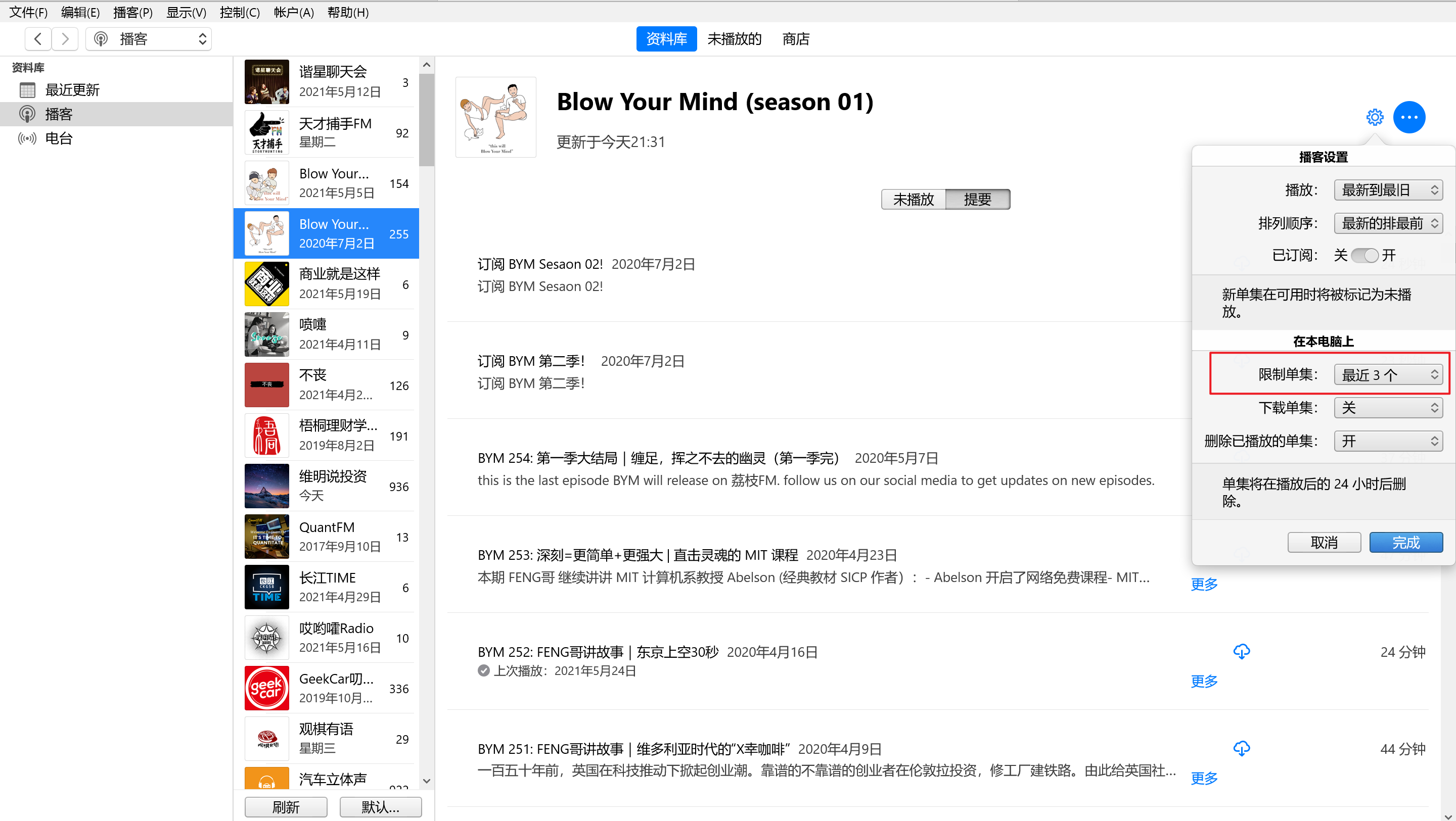播客设置中的“限制单集”选项是什么意思?具体作用是什么?